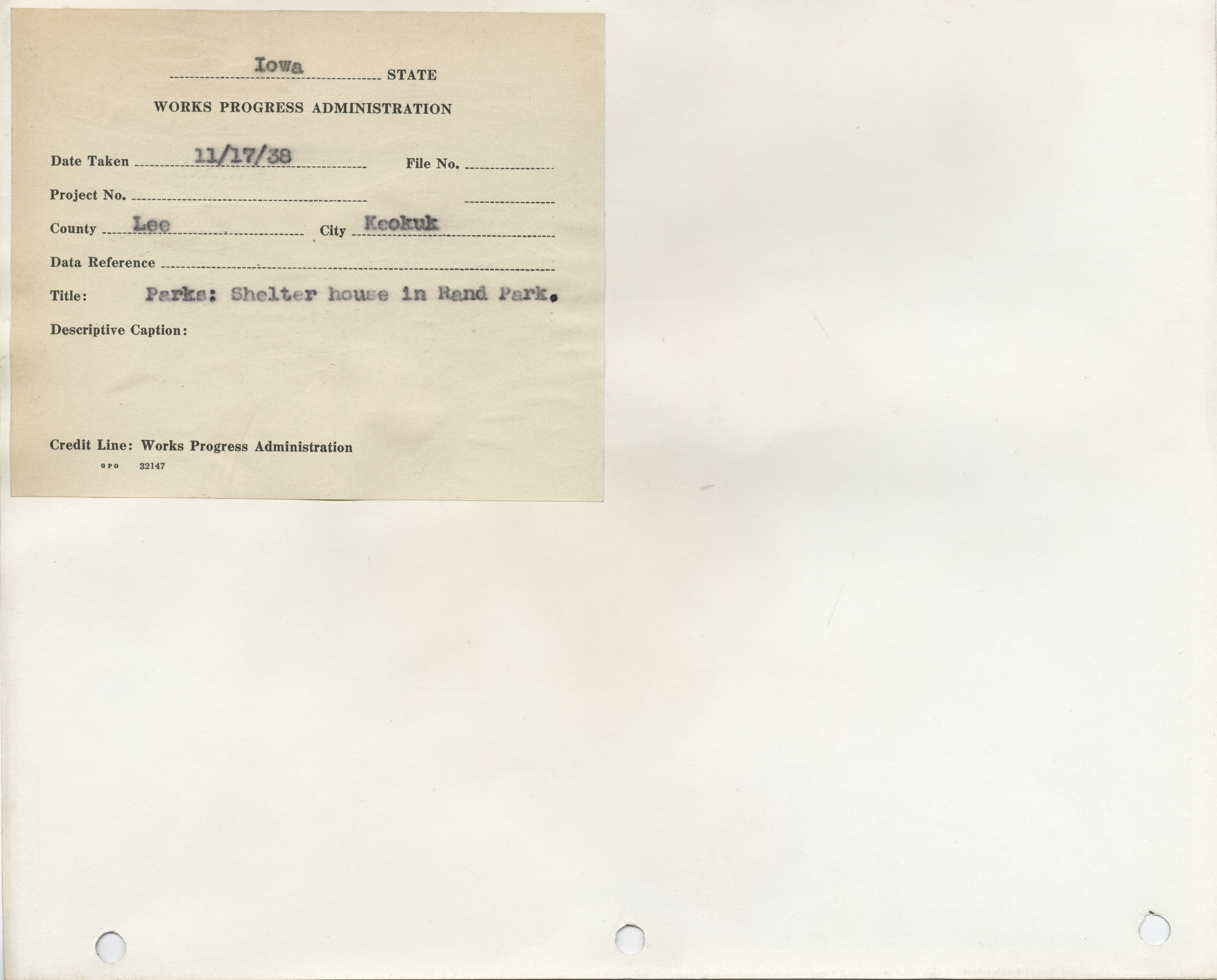 - "Photograph of a shelter house at Rand Park in Keokuk", Work Projects Administration (Iowa) Photographs, Iowa State University Library Digital Collections