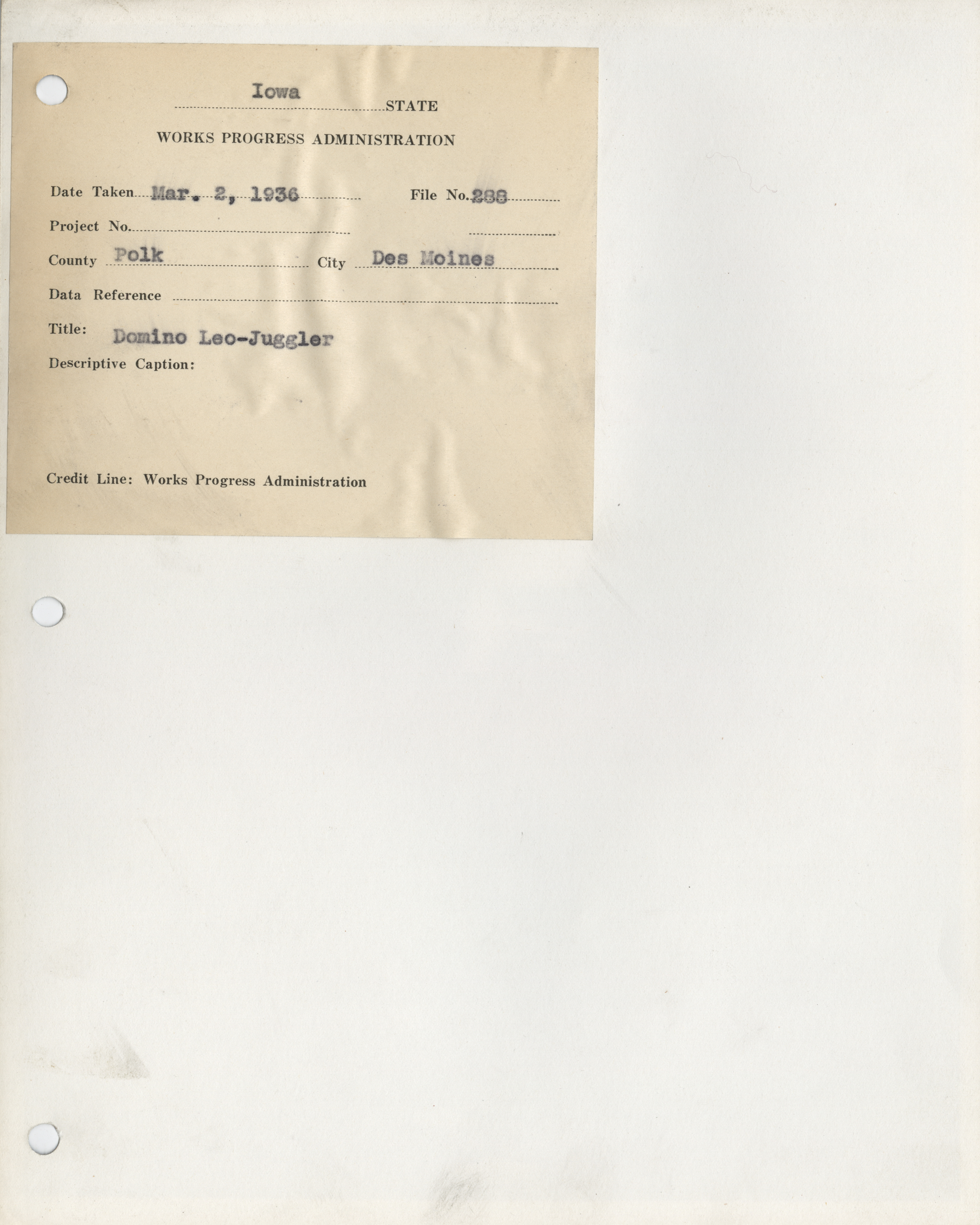 - "Photograph of Domino Leo, a juggler in Des Moines", Work Projects Administration (Iowa) Photographs, Iowa State University Library Digital Collections