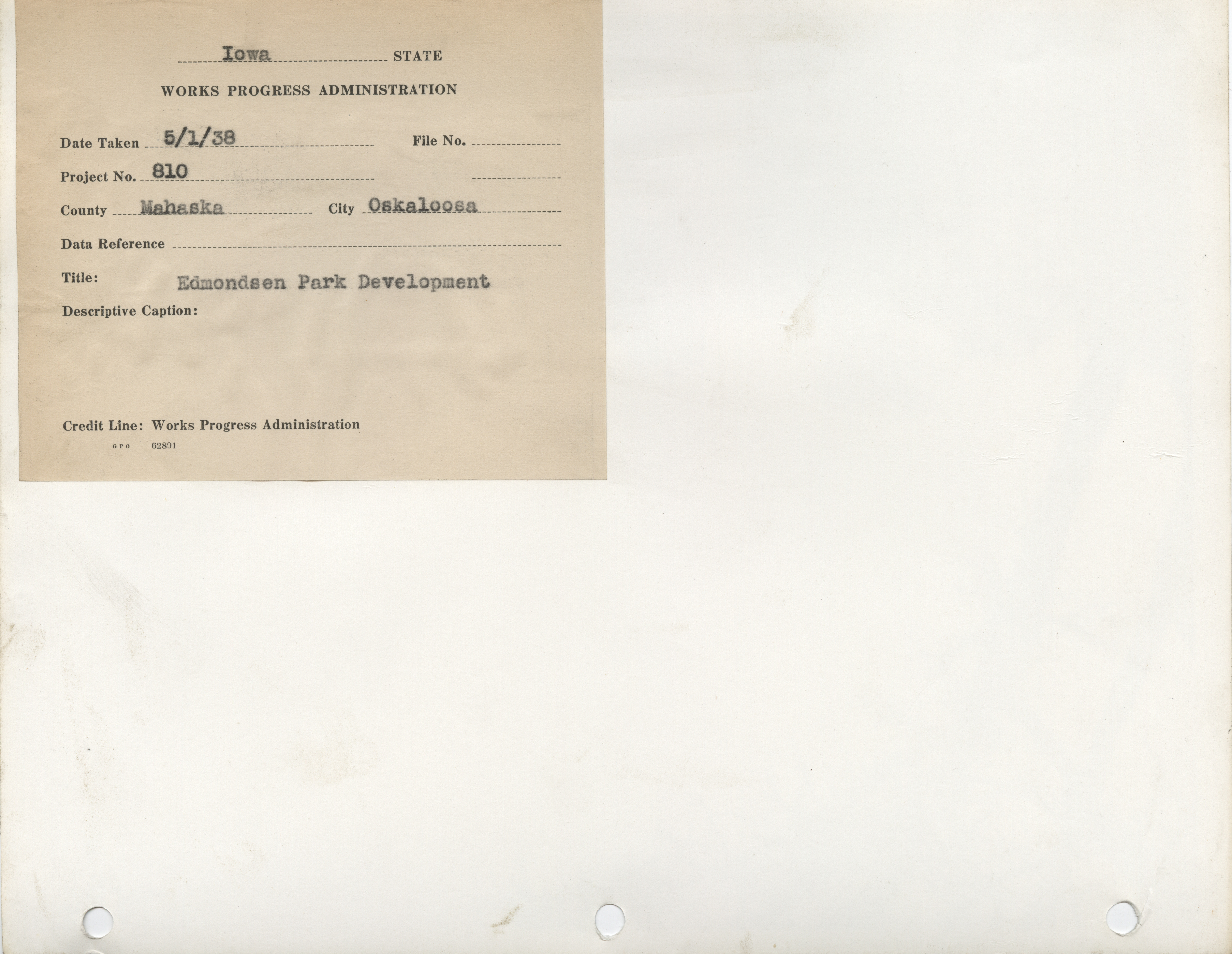 - Parks. Mahaska County. Oskaloosa. Edmondson Park Development. Project 810. (2 b/w photographs), 1938