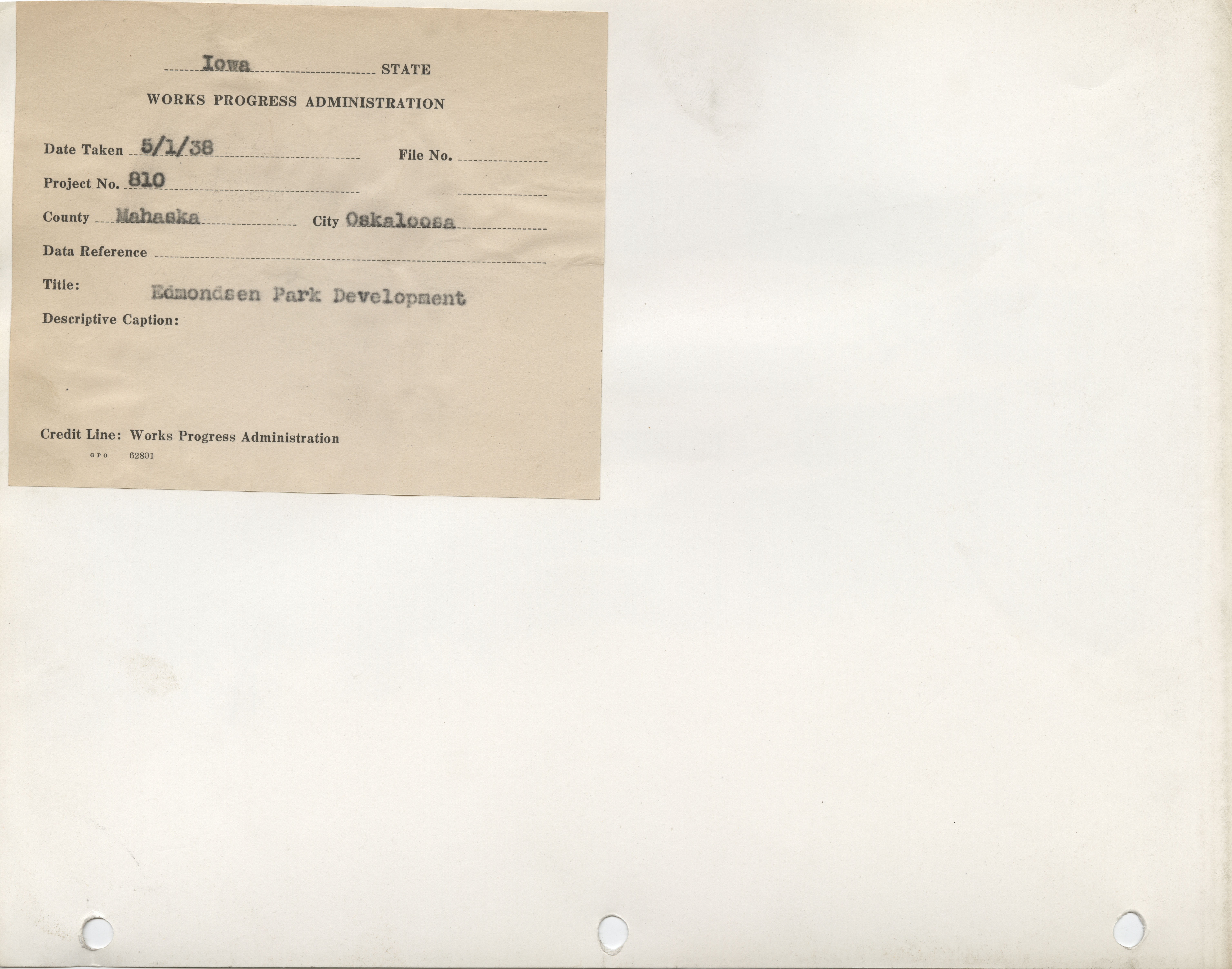 - Parks. Mahaska County. Oskaloosa. Edmondson Park Development. Project 810. (2 b/w photographs), 1938