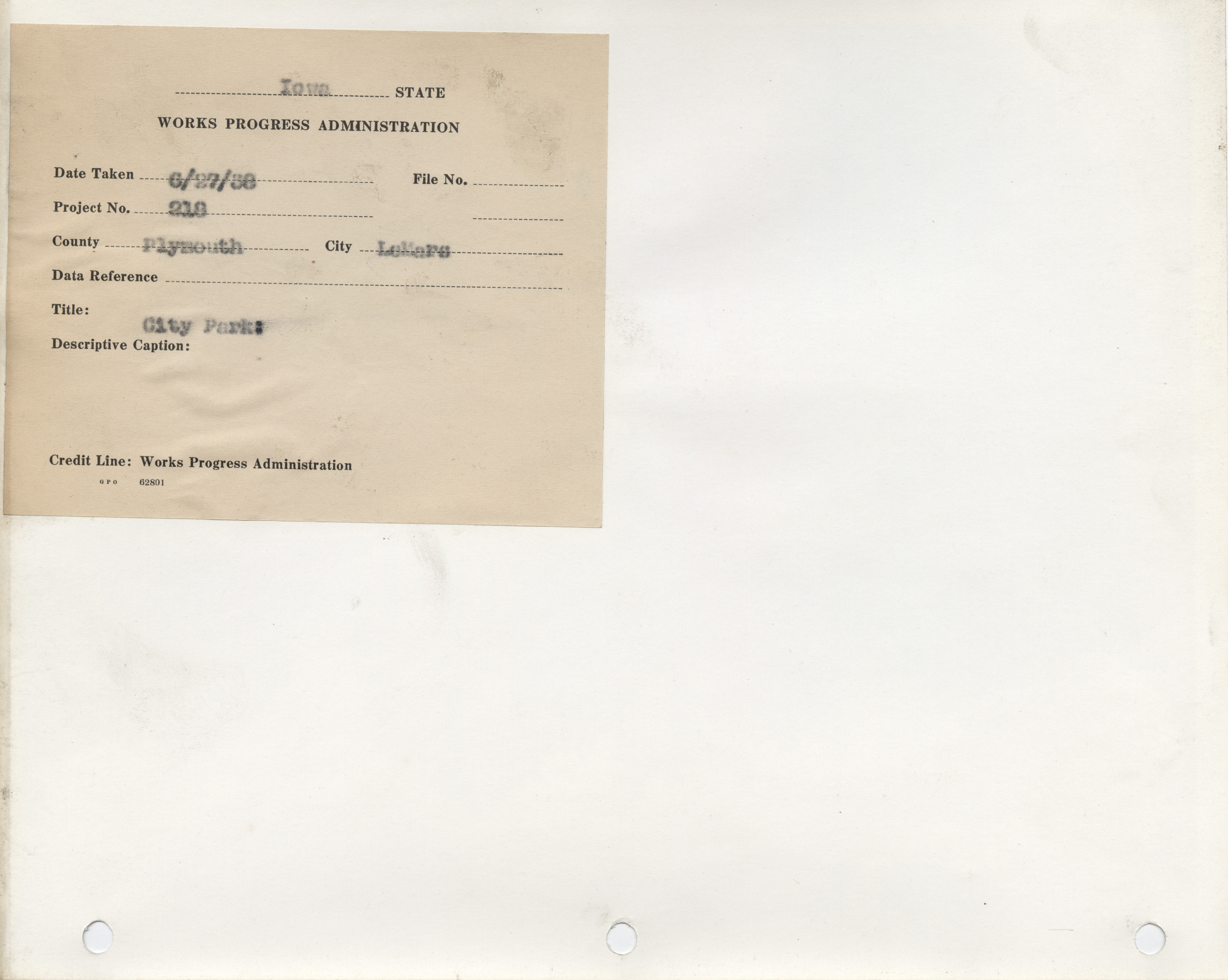 - Parks. Plymouth county. Le Mars. City Park Structures. Project 218. (7 b/w photographs), 1936-1938