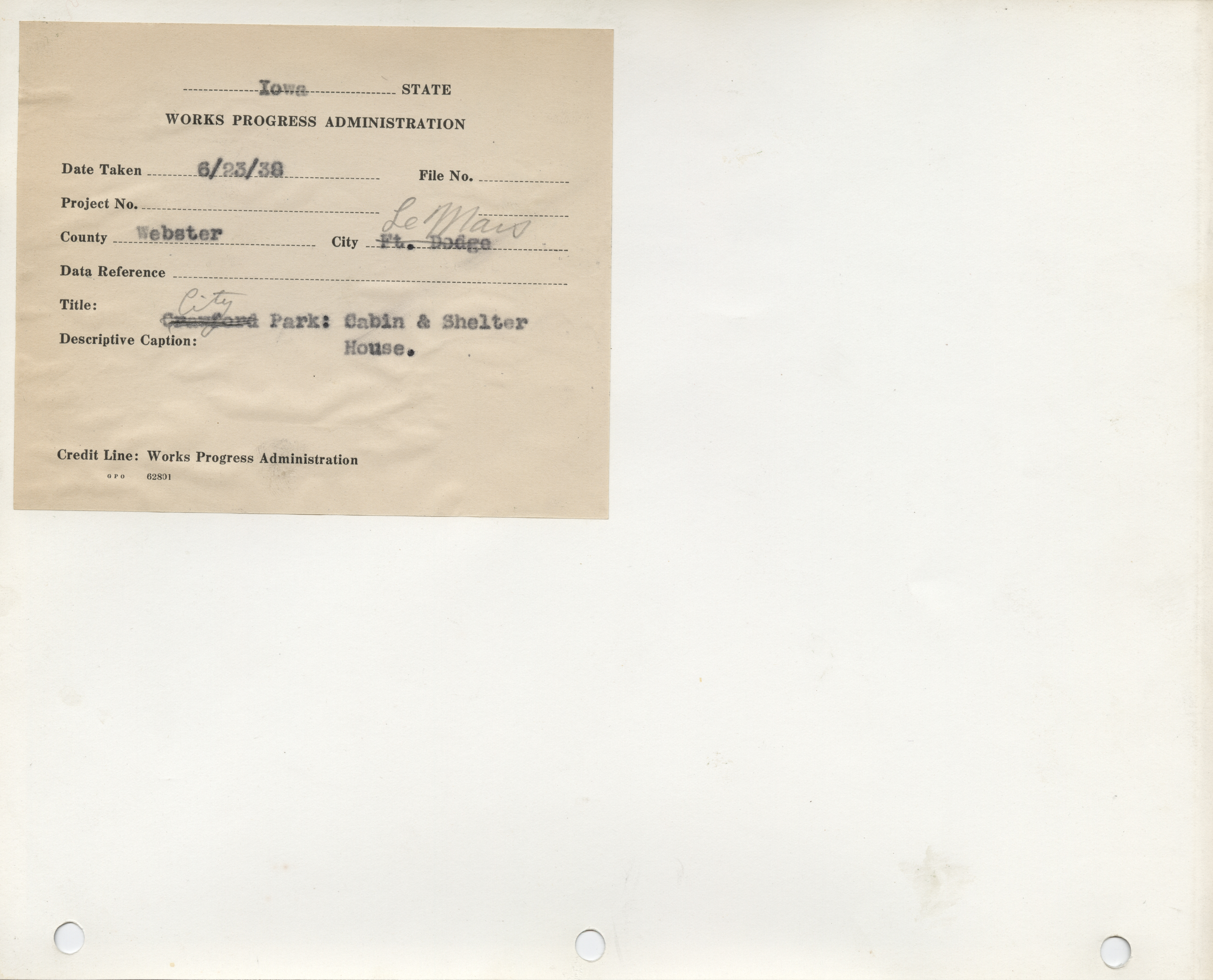 - "Photograph of a cabin and shelter house at a city park in Le Mars", Work Projects Administration (Iowa) Photographs, Iowa State University Library Digital Collections