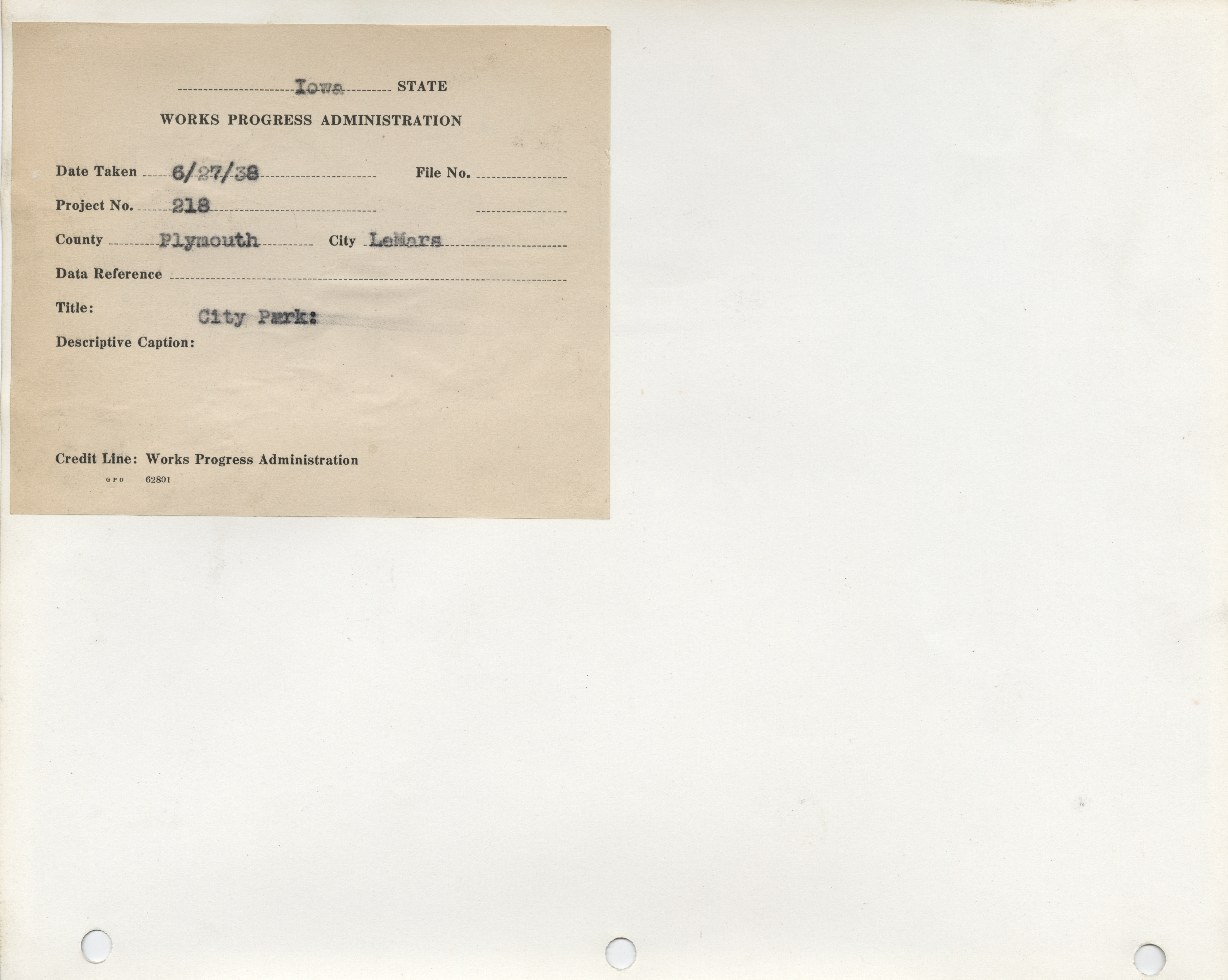 - Parks. Plymouth county. Le Mars. City Park Structures. Project 218. (7 b/w photographs), 1936-1938