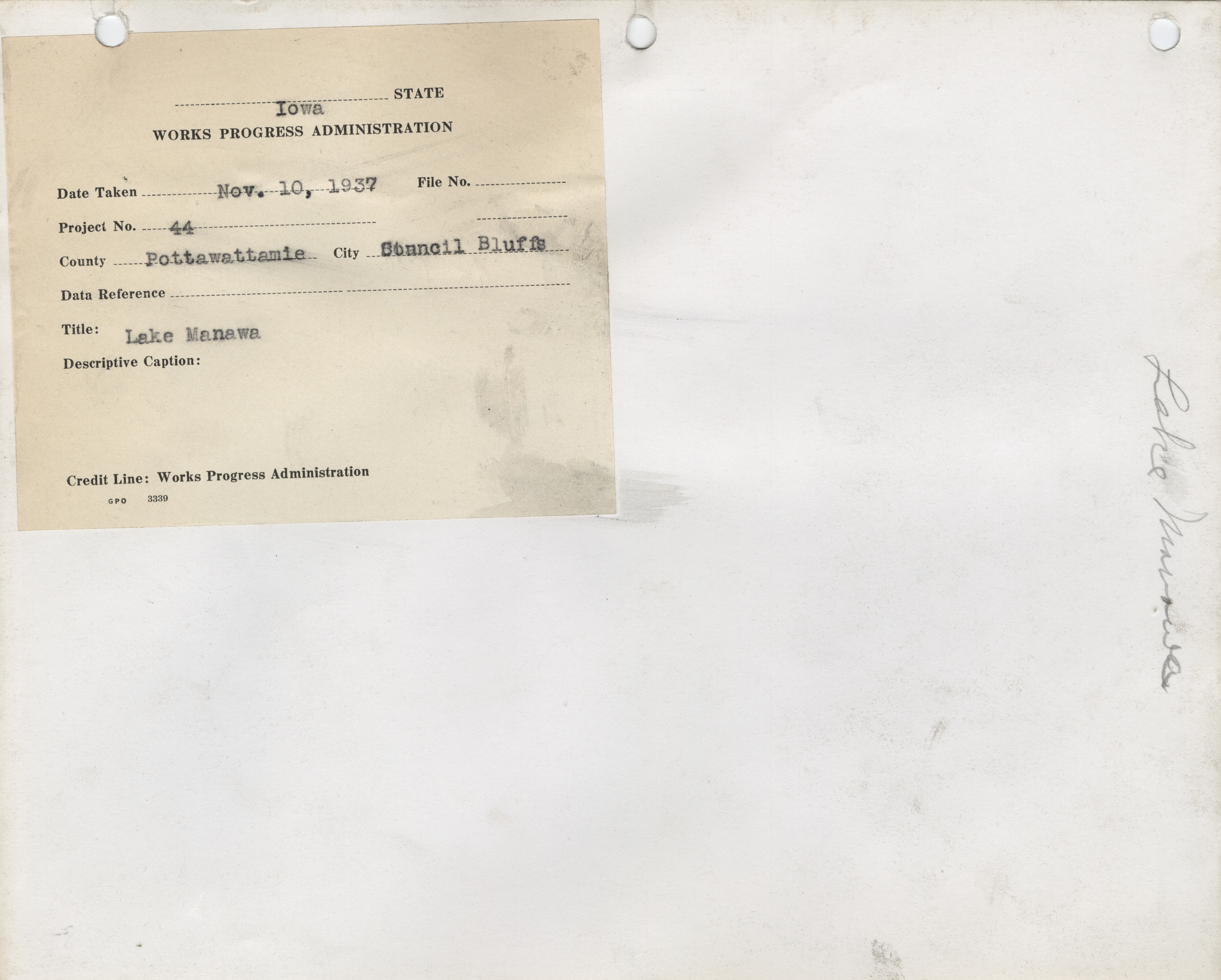 - Parks. Pottawattamie County. Council Bluffs. Lake Manawa. Project 44. (1 b/w photograph), 1937
