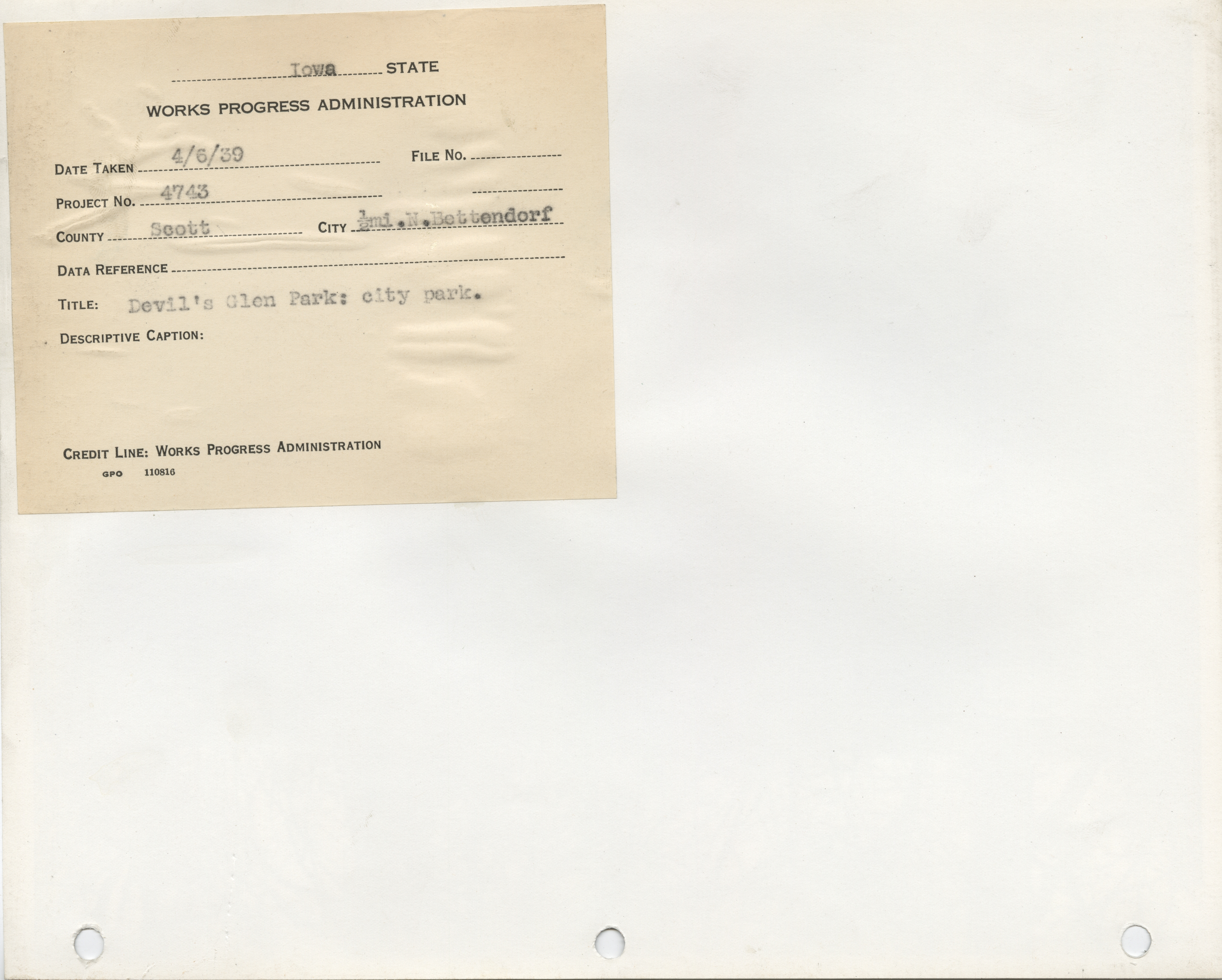 - Parks. Scott County. Bettendorf. Devil's Glen State Park. Project 4743. (2 b/w photographs), 1939