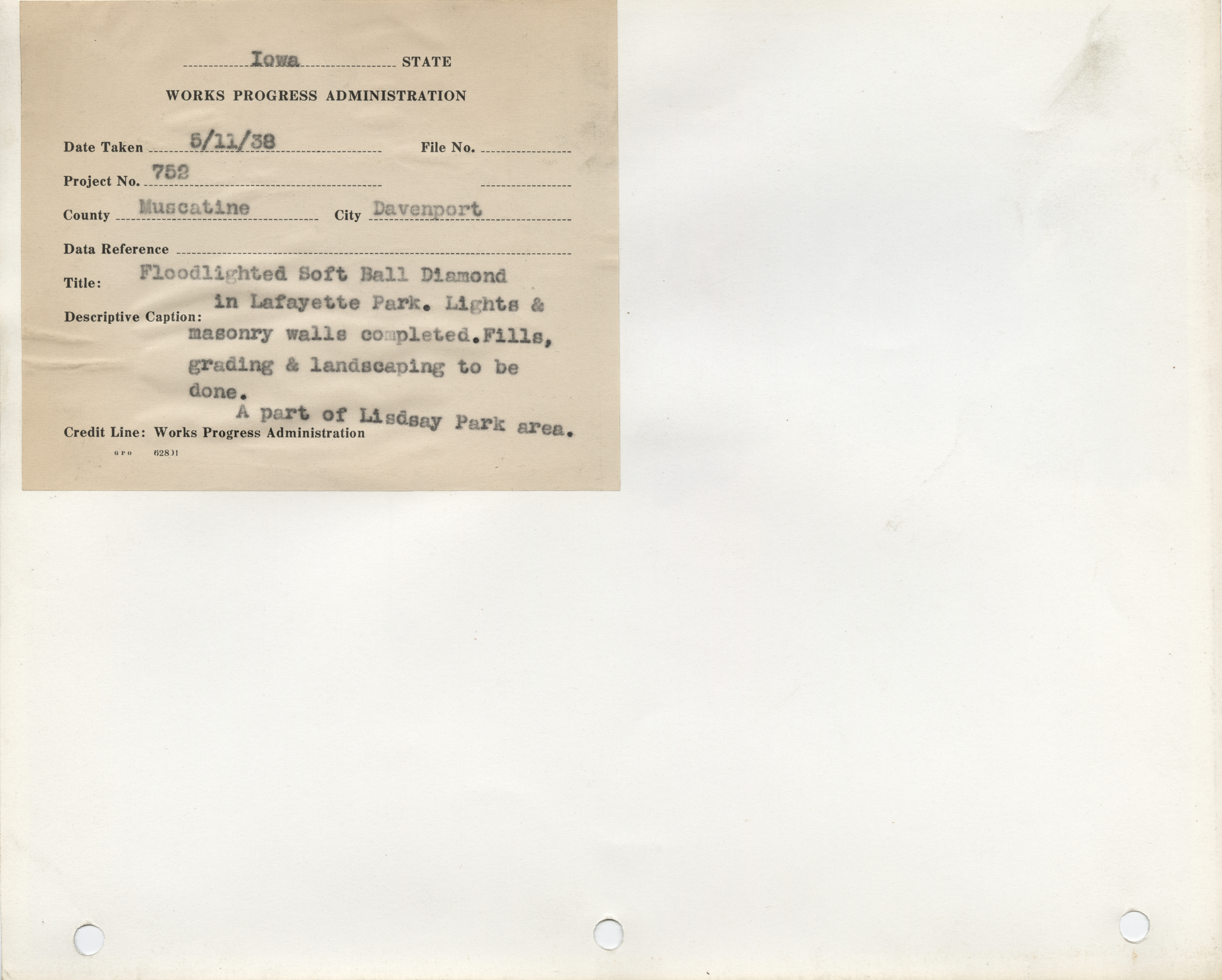 - Parks. Scott County. Davenport. Lafayette Park Softball Diamond. Project 752. (1 b/w photograph), 1938