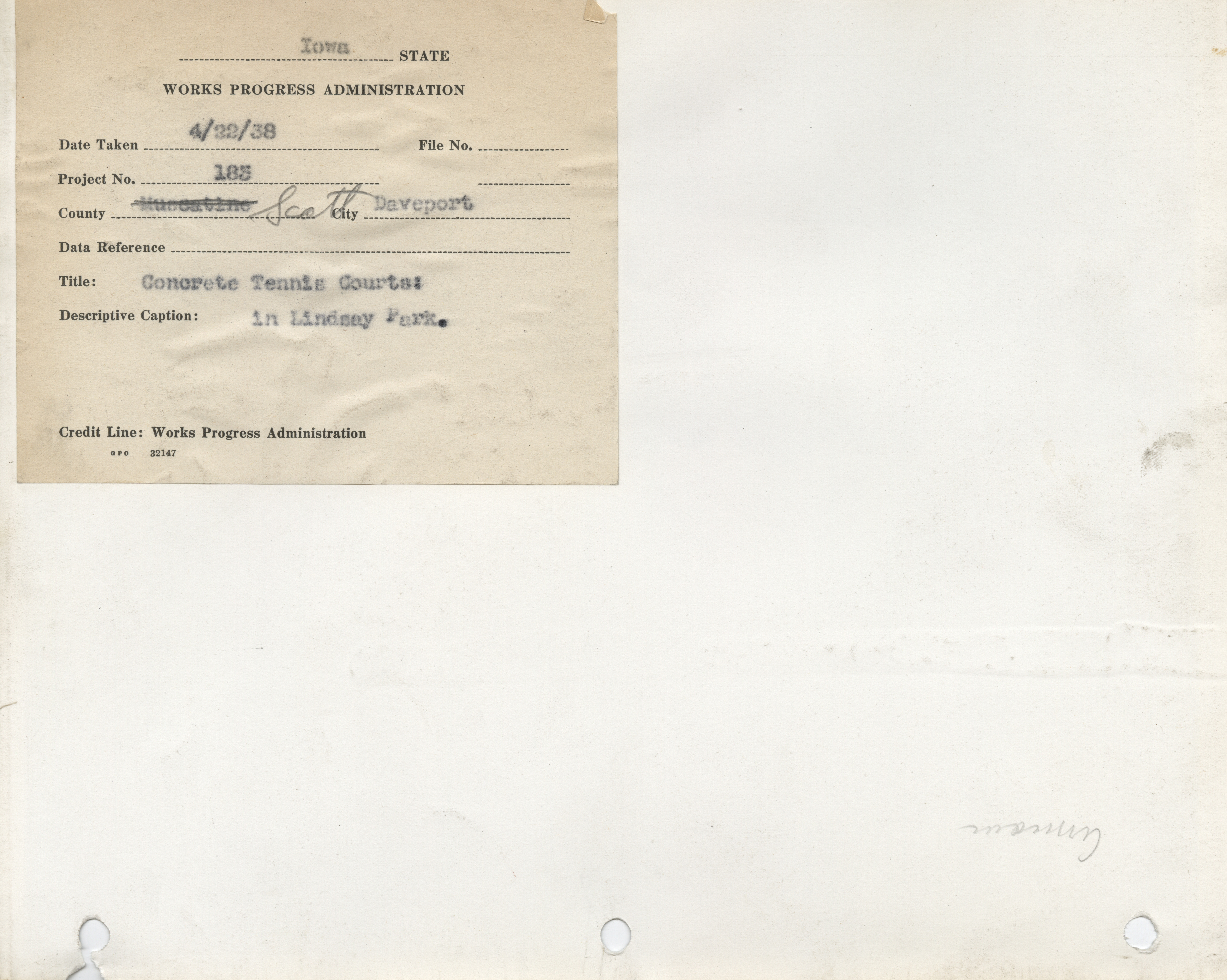 - Parks. Scott County. Davenport. Lindsay Park Tennis Courts. Project 183. (1 b/w photograph), 1938