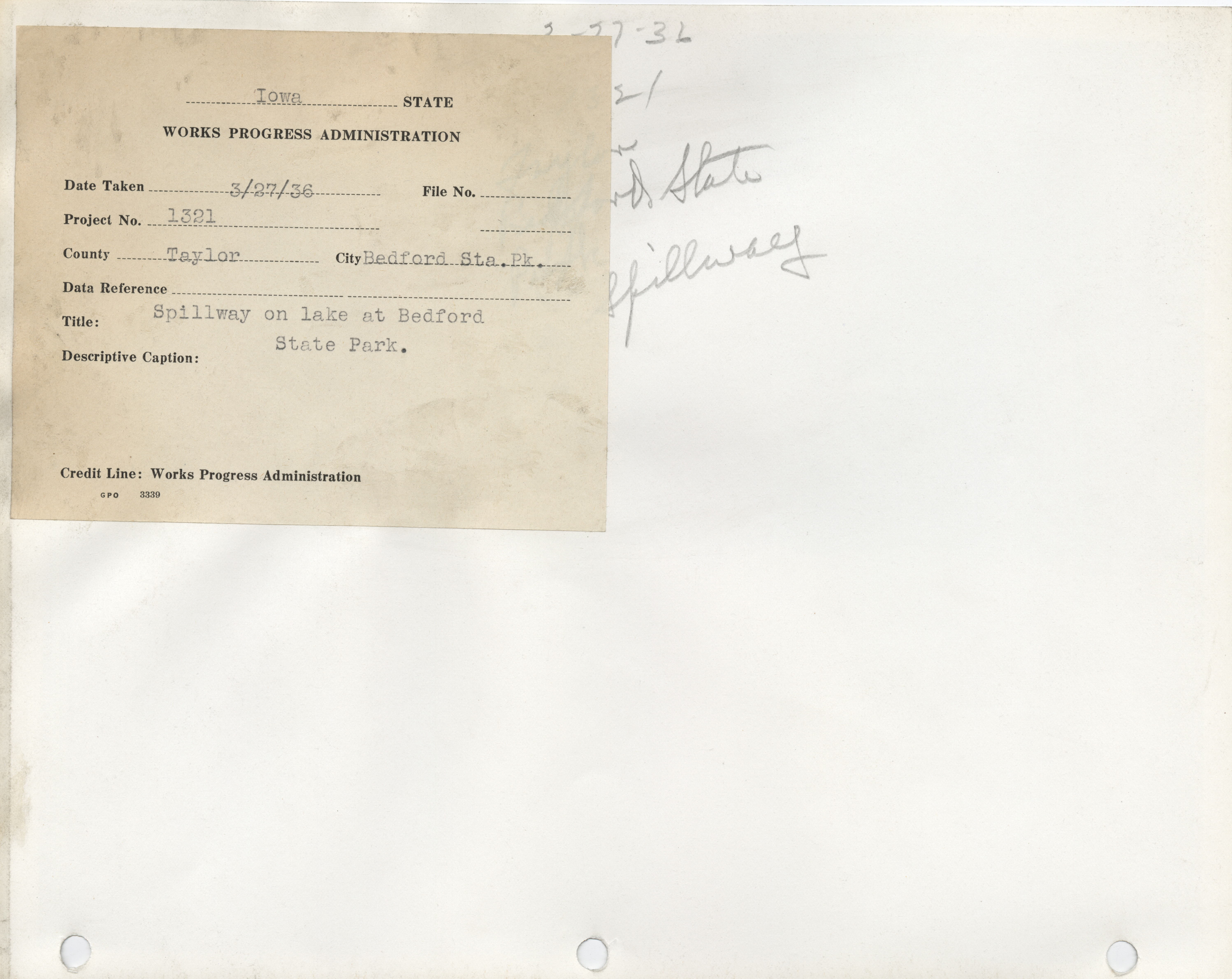 - Parks. Taylor County. Bedford. Bedford State Park. Project 1321. (3 b/w photographs), 1936-1937
