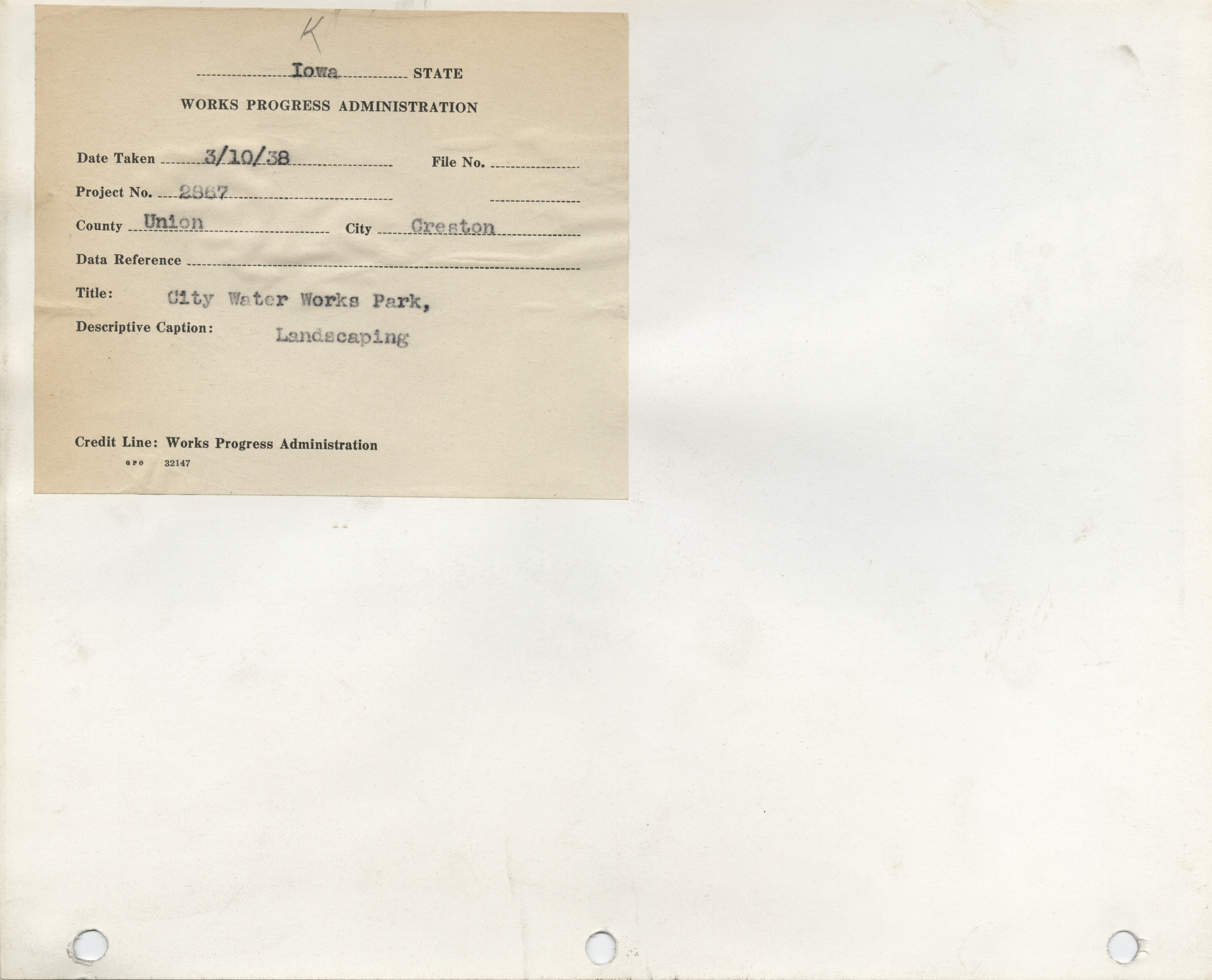 - Parks. Union County. Creston. City Waterworks Park Landscaping. Project 2867. (1 b/w photograph), 1938