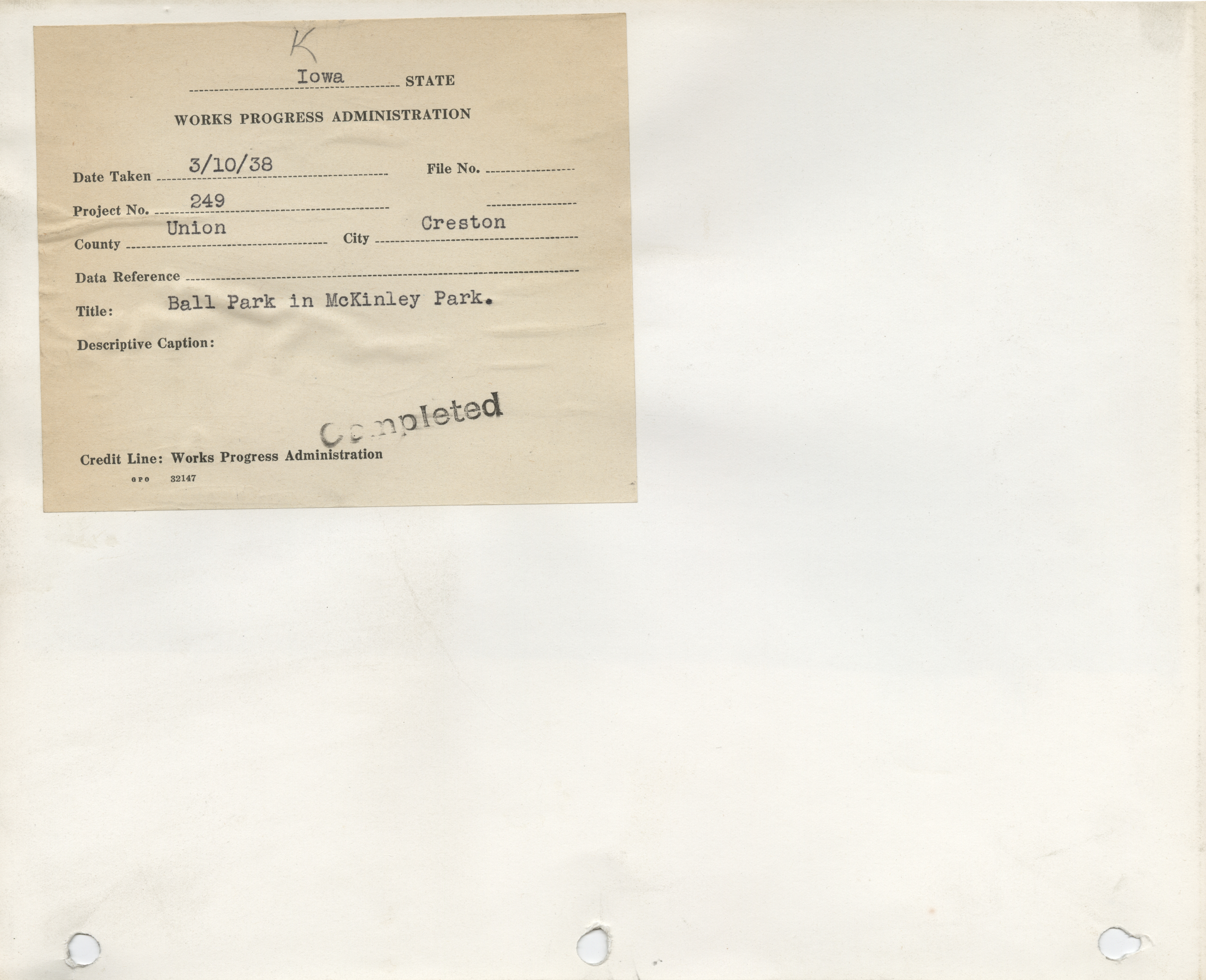 - Parks. Union County. Creston. McKinley Park Ball Diamond. Project 249. (1 b/w photograph), 1938