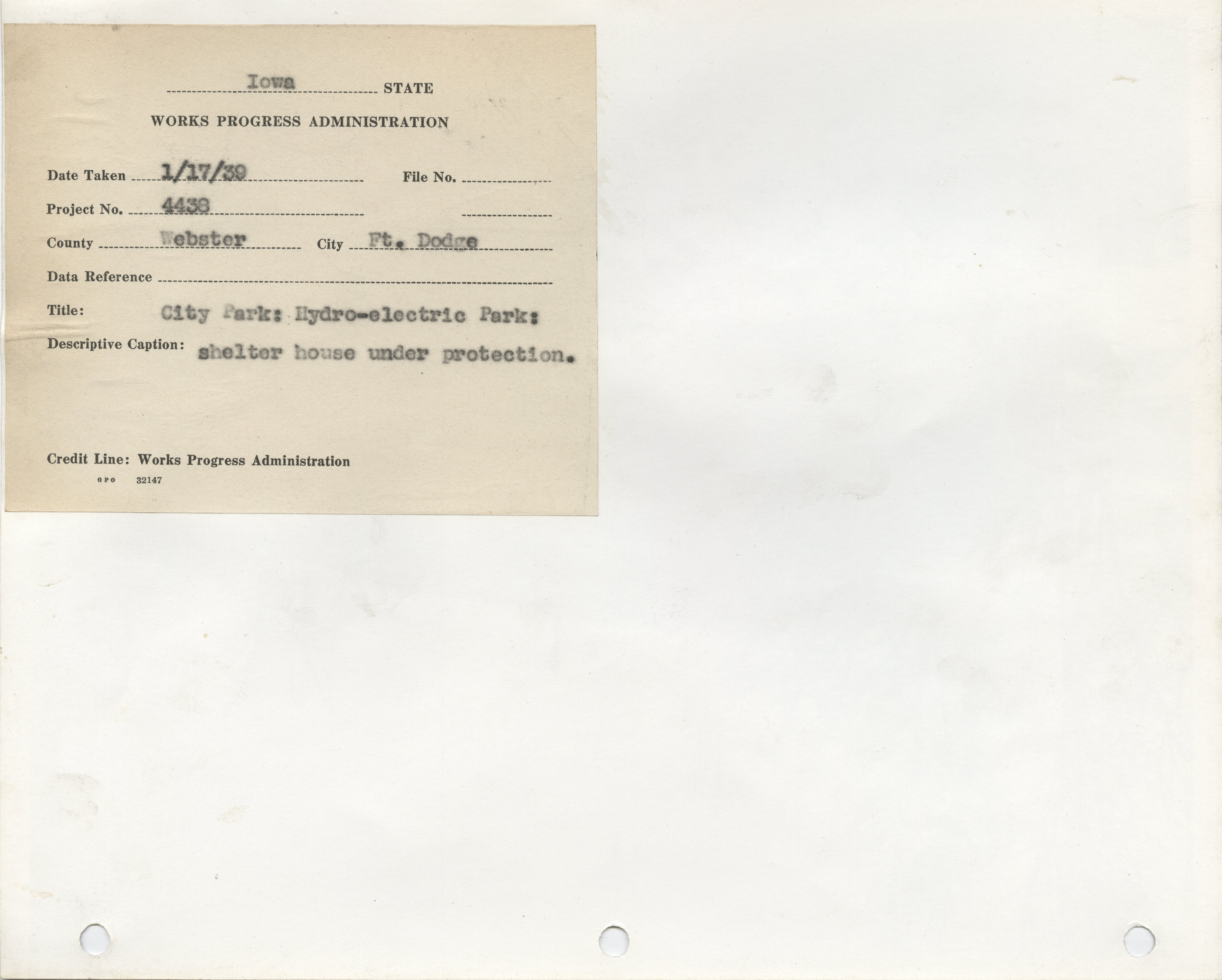- Parks. Webster County. Fort Dodge. Hydro-Electric Park Shelter. Project 4438. (3 b/w photographs), 1939
