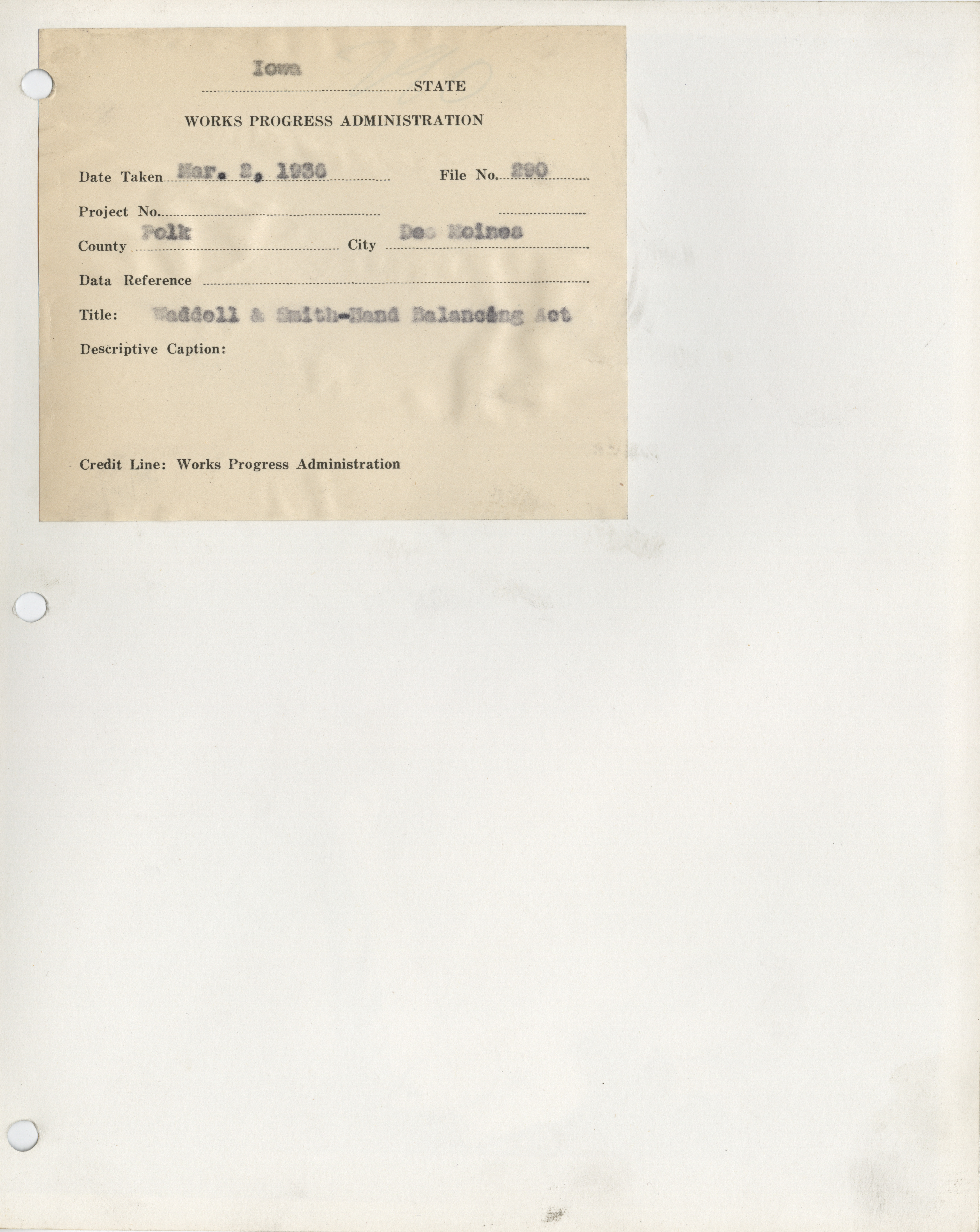 - "Photograph of Waddell and Smith, a hand balancing act in Des Moines", Work Projects Administration (Iowa) Photographs, Iowa State University Library Digital Collections