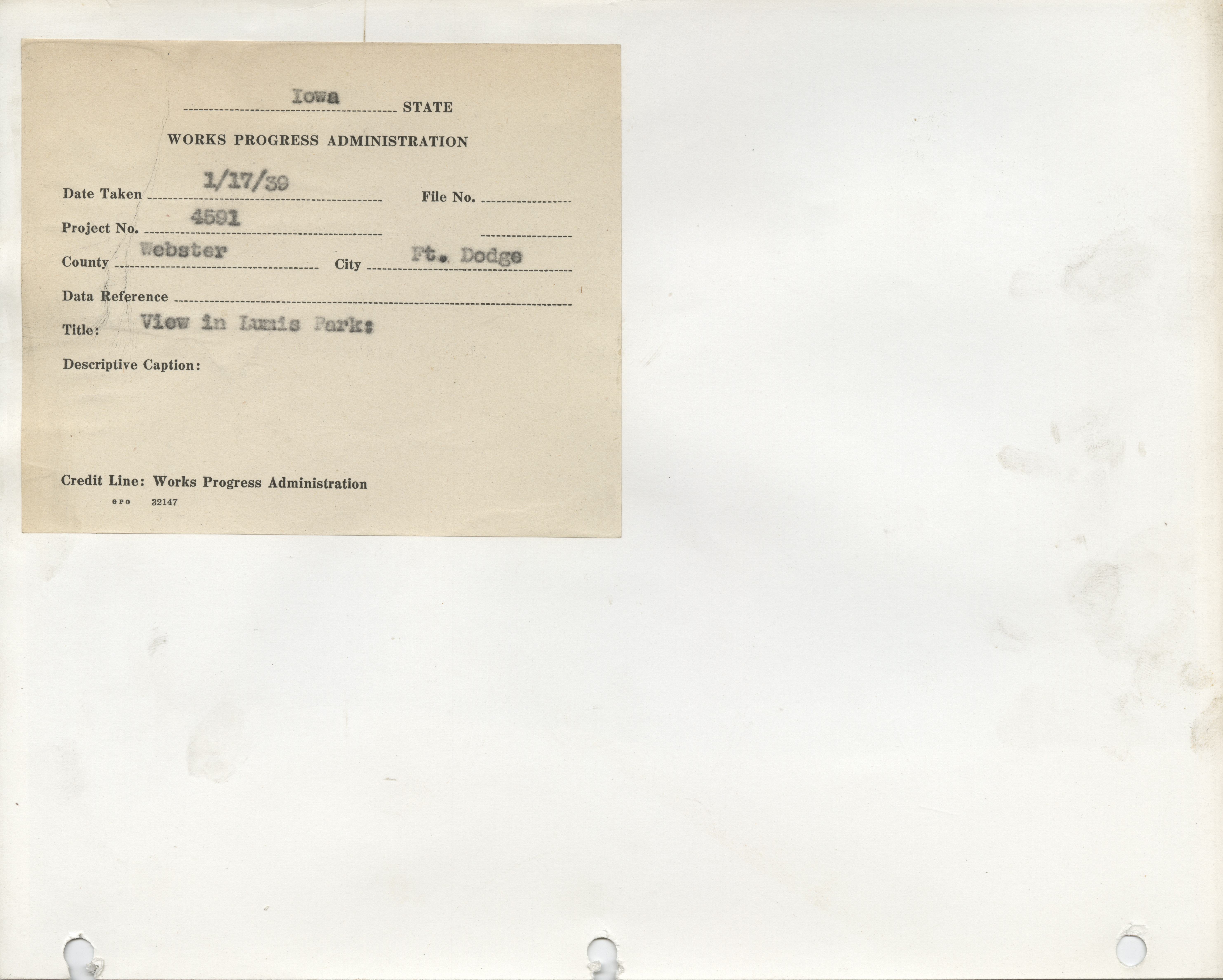 - Parks. Webster County. Fort Dodge. Lumis Park View. Project 4591. (1 b/w photograph), 1939