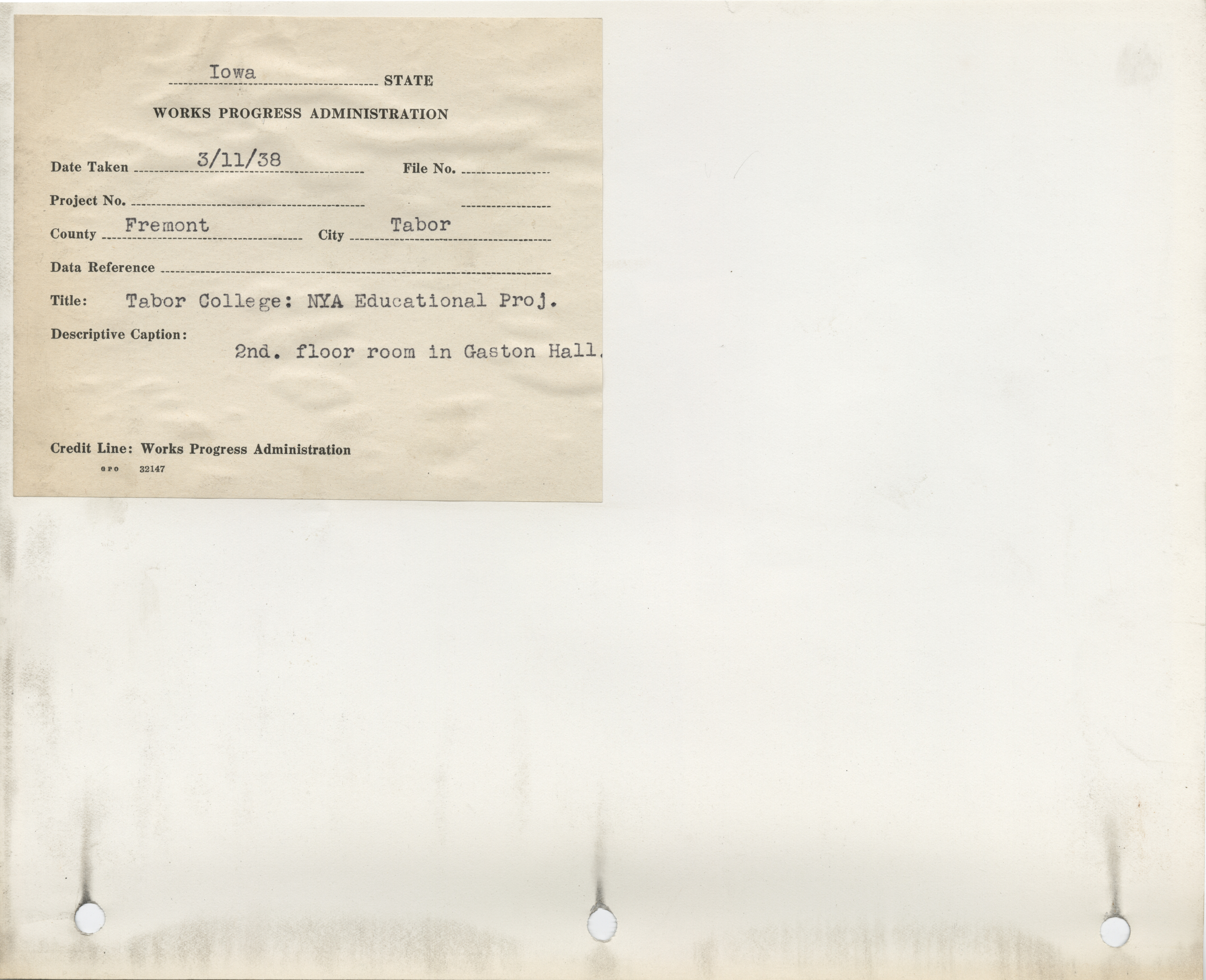 - "Photograph of a 2nd floor room in Gaston Hall at Tabor College in Tabor", Work Projects Administration (Iowa) Photographs, Iowa State University Library Digital Collections