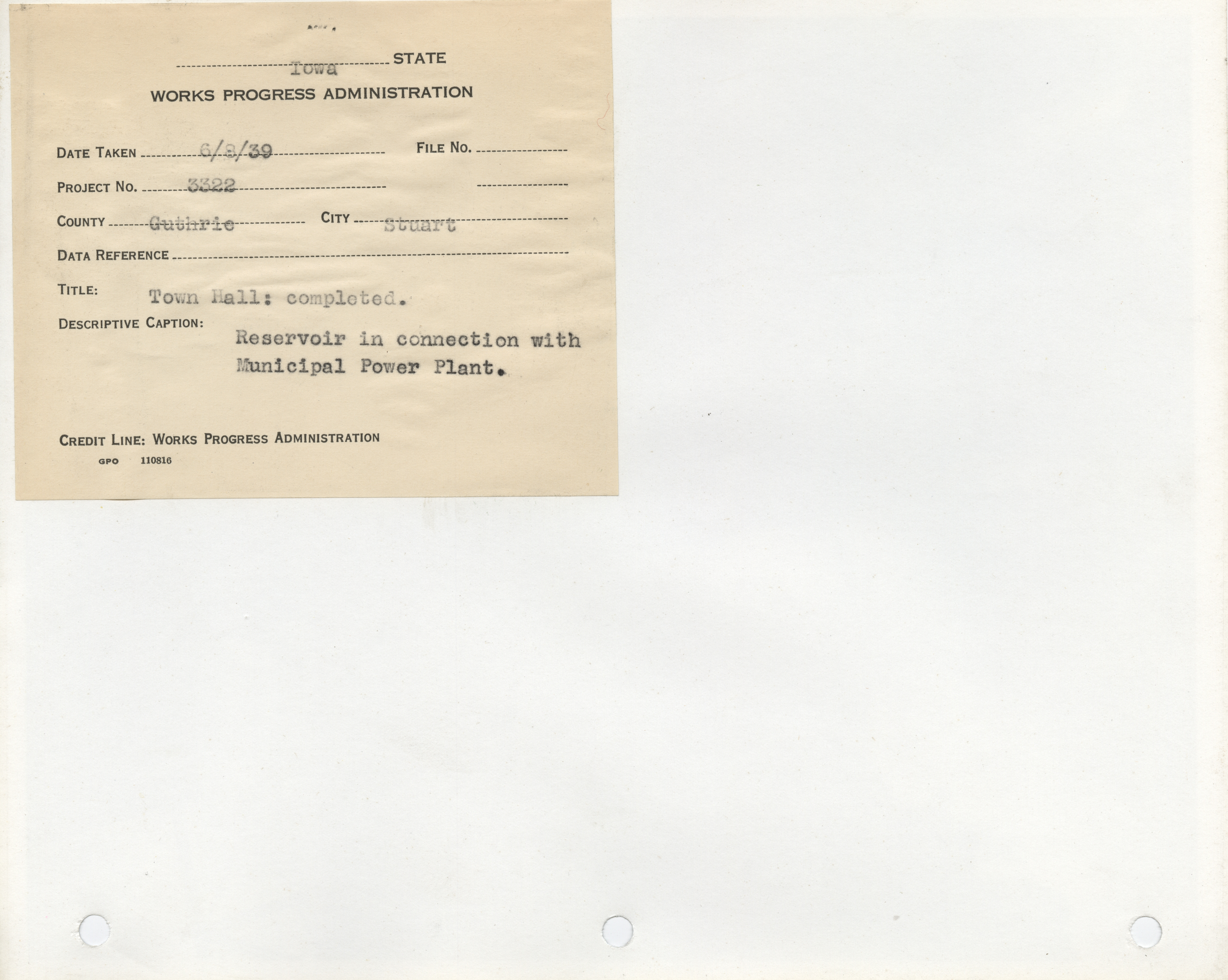 - Public Buildings. Guthrie County. Stuart. Town Hall and Reservoir. Project 3322. (2 b/w photographs), 1939