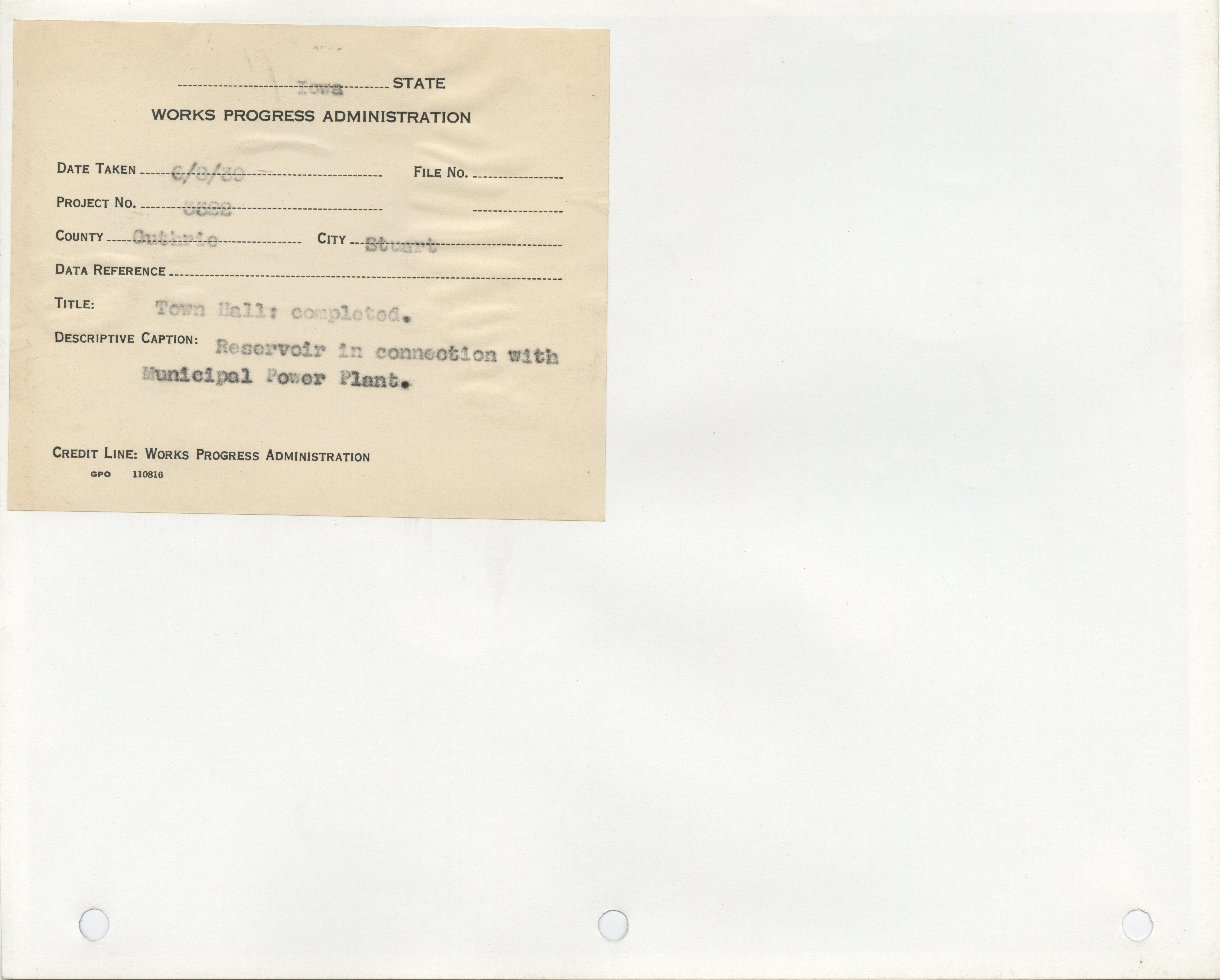 - Public Buildings. Guthrie County. Stuart. Town Hall and Reservoir. Project 3322. (2 b/w photographs), 1939