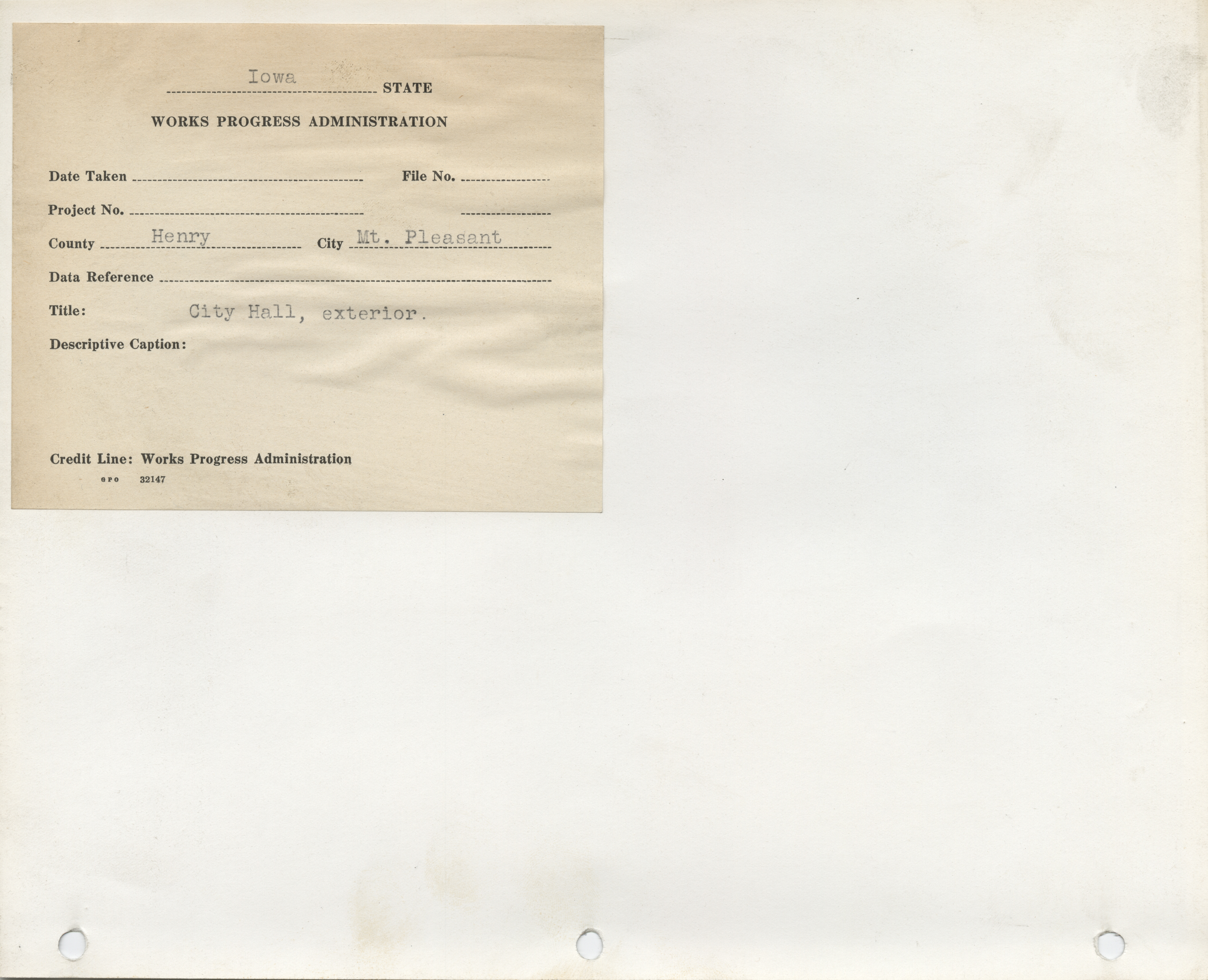 - "Photograph of the city hall in Mount Pleasant", Work Projects Administration (Iowa) Photographs, Iowa State University Library Digital Collections