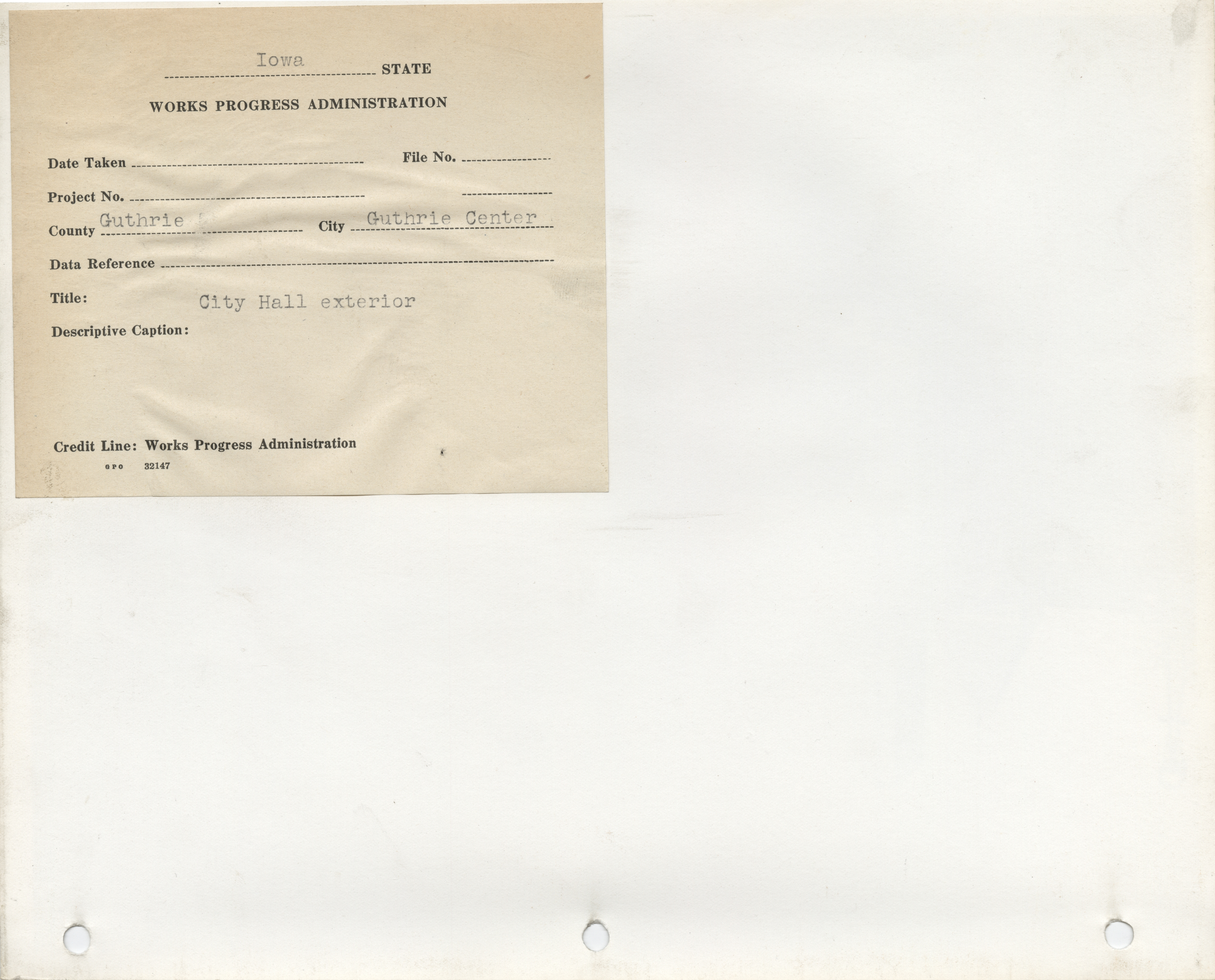 - "Photograph of the city hall in Guthrie Center", Work Projects Administration (Iowa) Photographs, Iowa State University Library Digital Collections