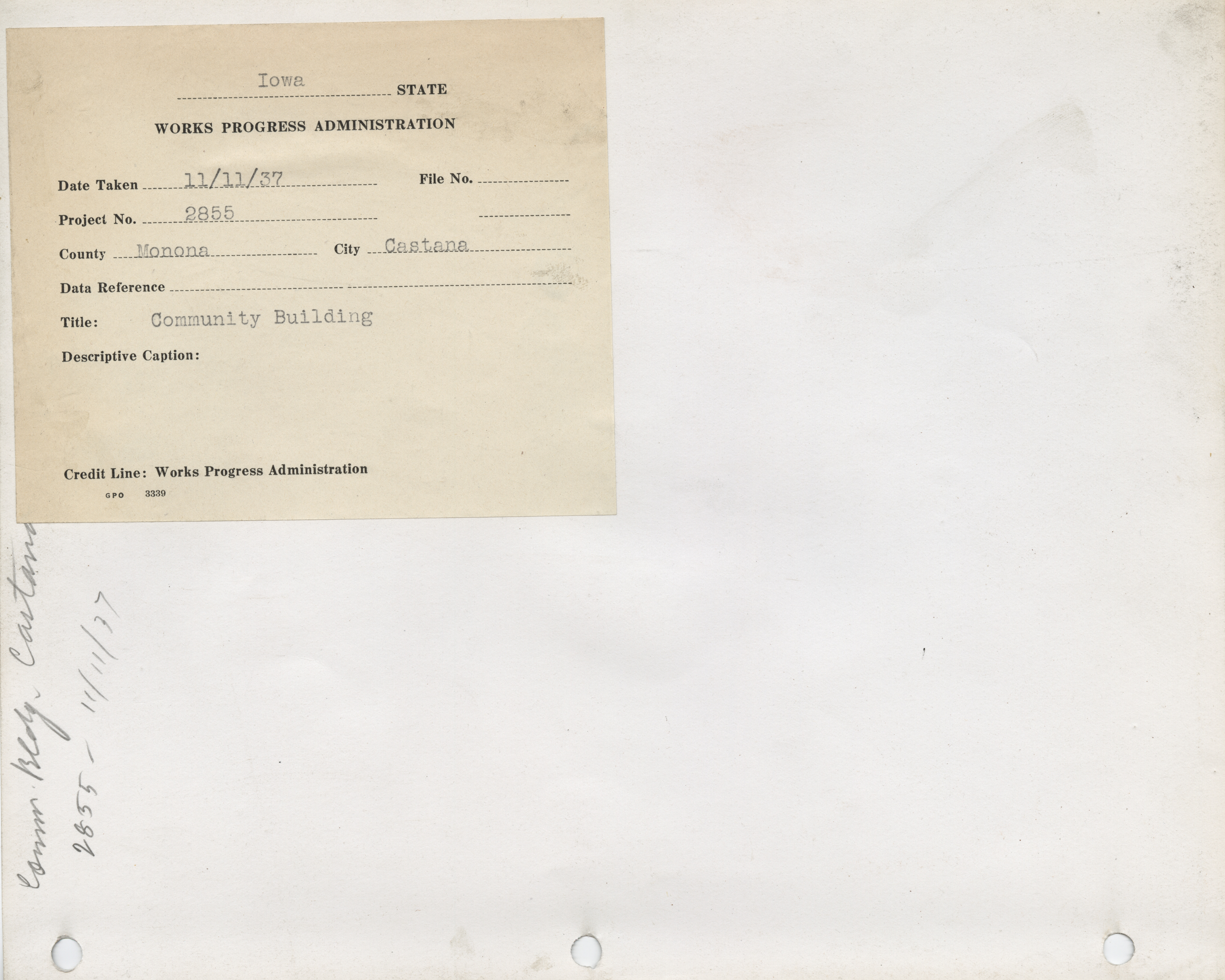 - Public Buildings. Monona County. Castana. Community Building. Project 2855. (1 b/w photograph), 1937