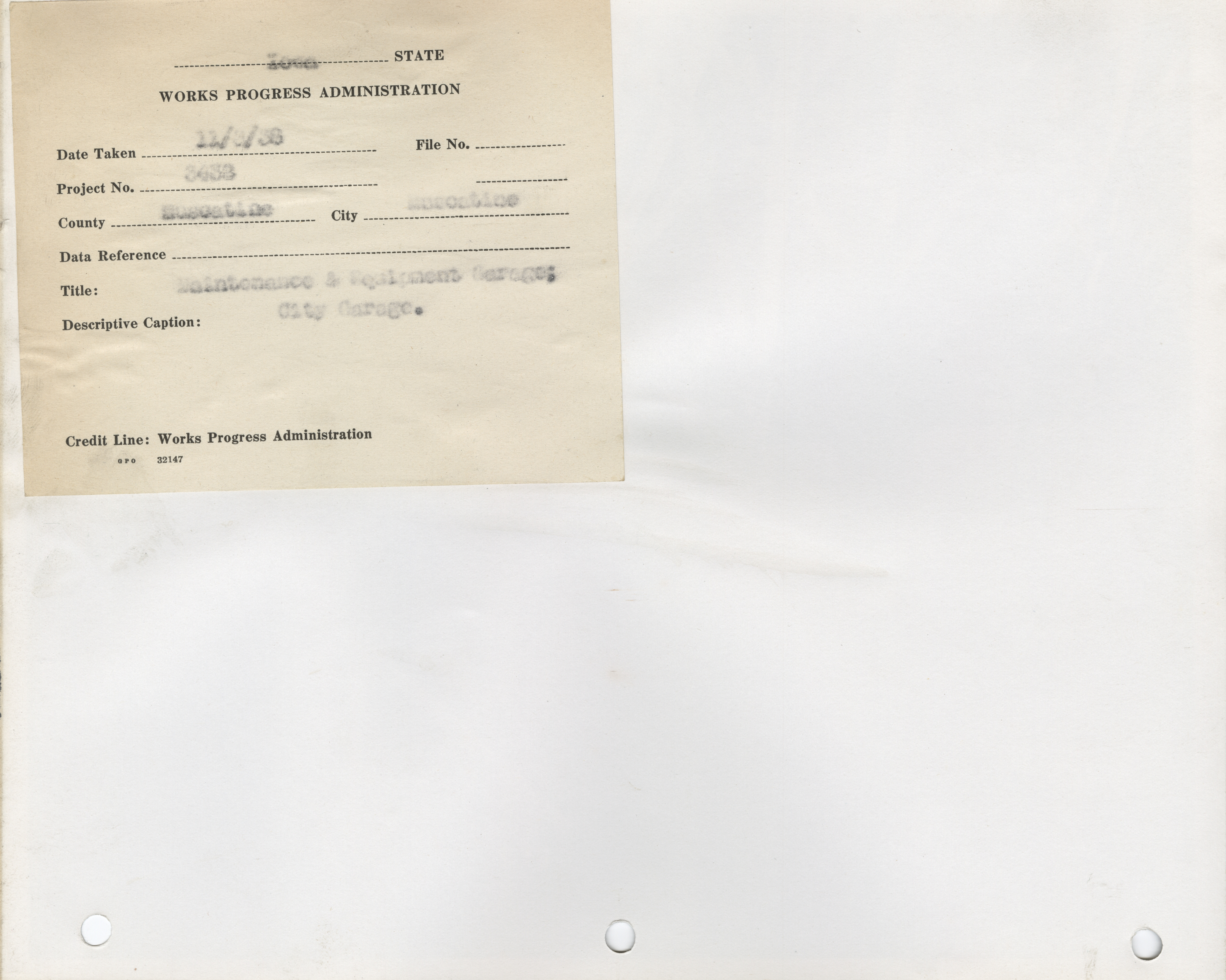 - Public Buildings. Muscatine County. Muscatine. Maintenance and Equipment Garage. Project 3438. (4 b/w photographs), 1938