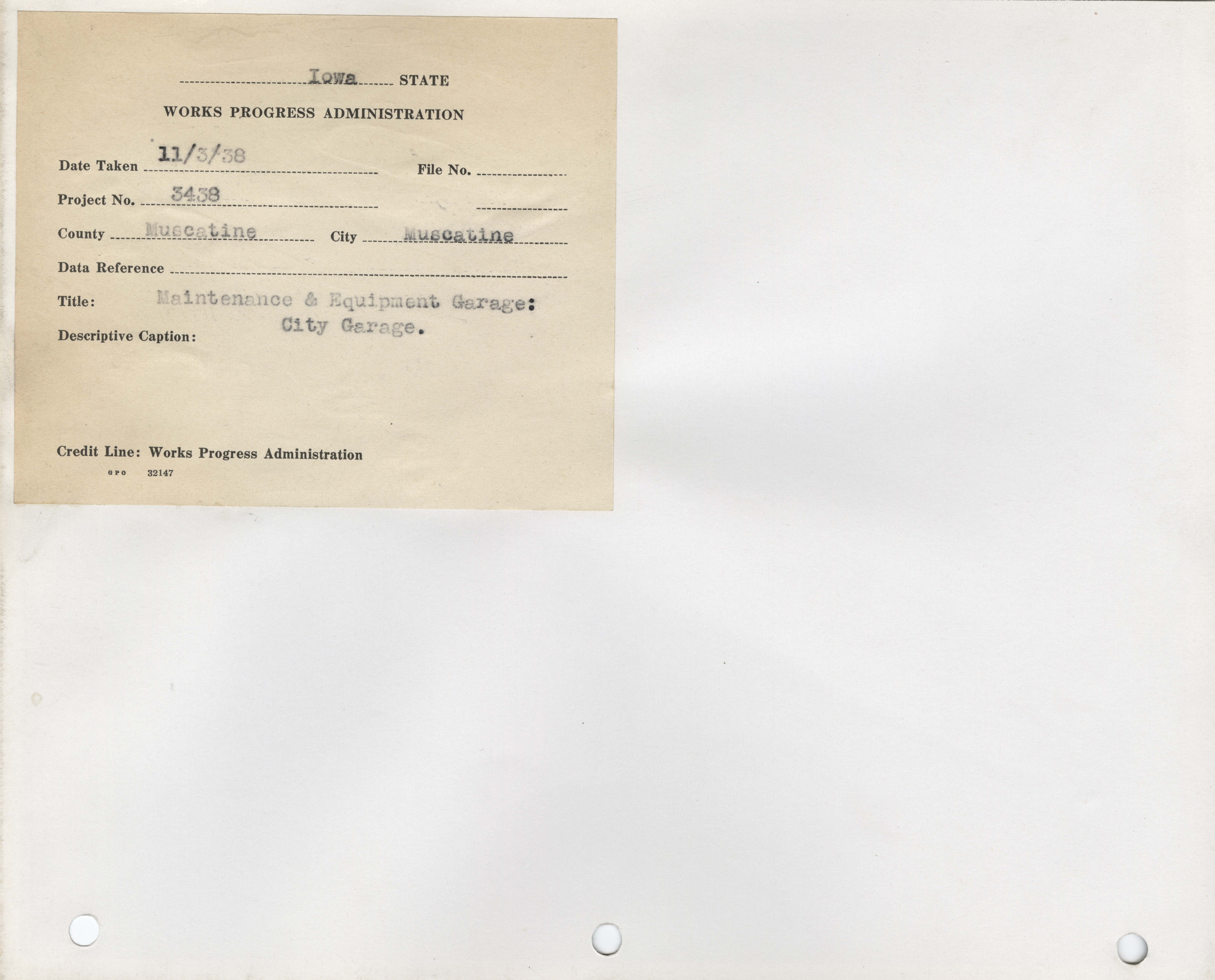 - Public Buildings. Muscatine County. Muscatine. Maintenance and Equipment Garage. Project 3438. (4 b/w photographs), 1938