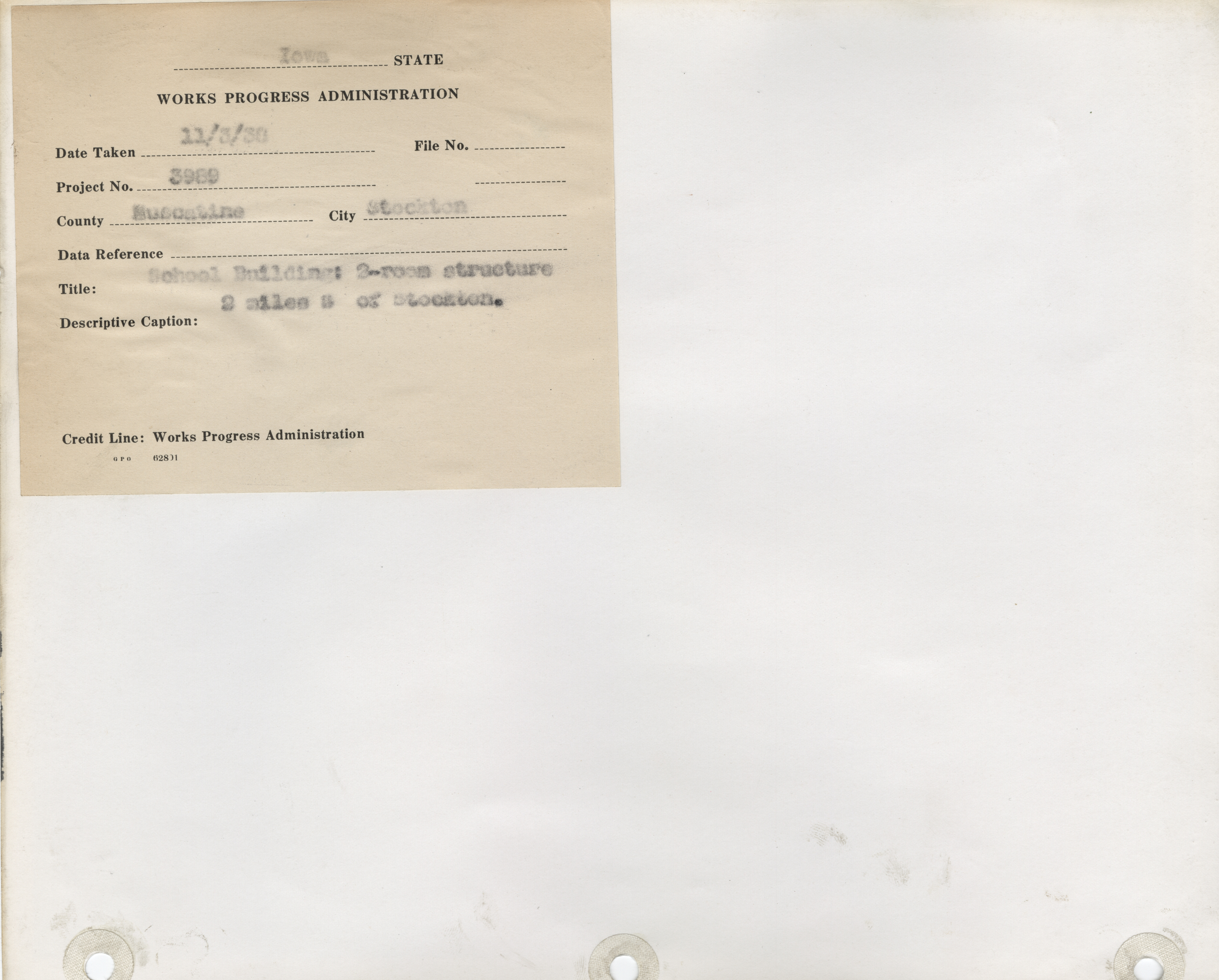 - Public Buildings. Muscatine County. Stockton. Repair of School Building. Project 3989. (4 b/w photographs), 1938