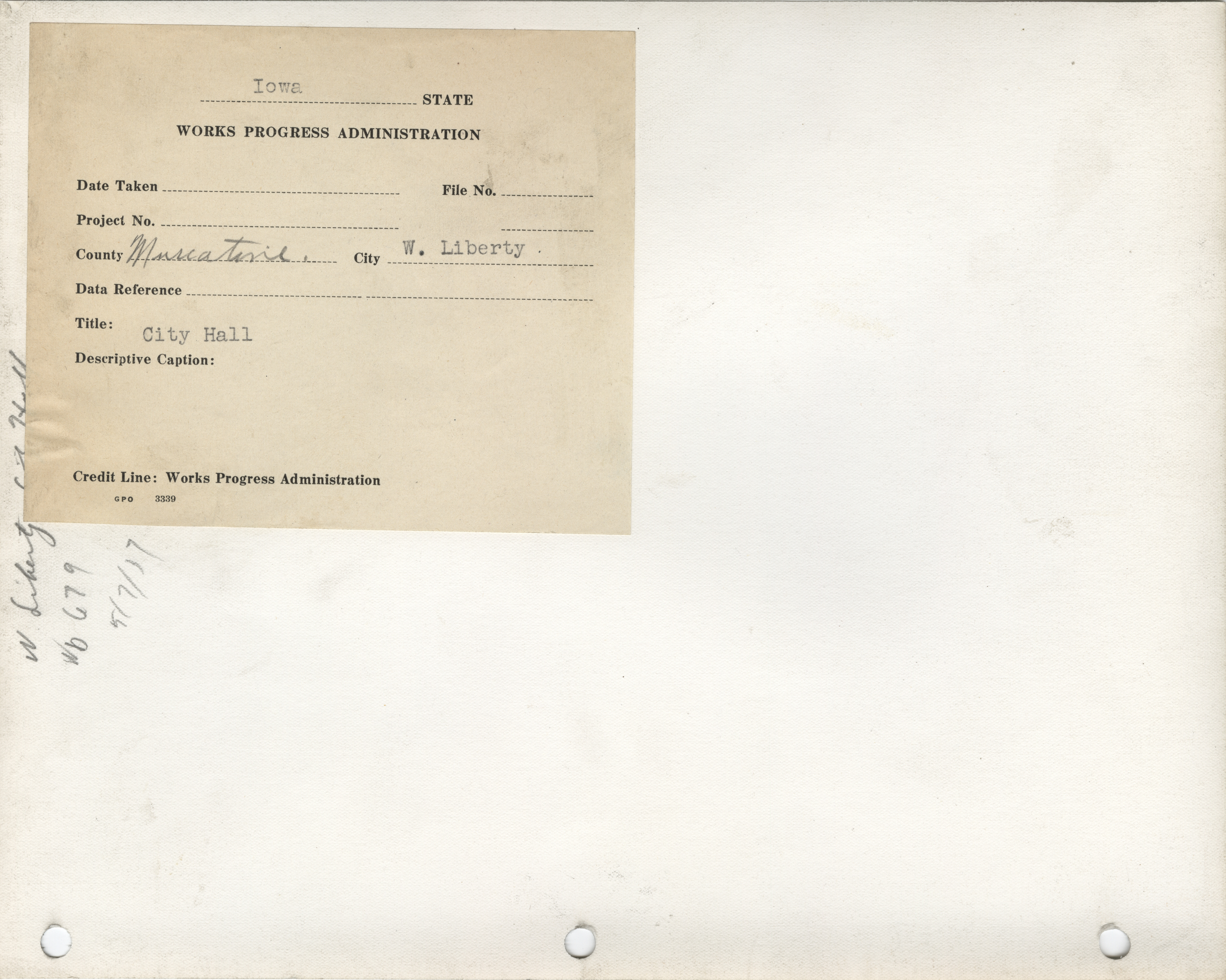 - Public Buildings. Muscatine County. West Liberty. Town Hall. (2 b/w photographs), 1937