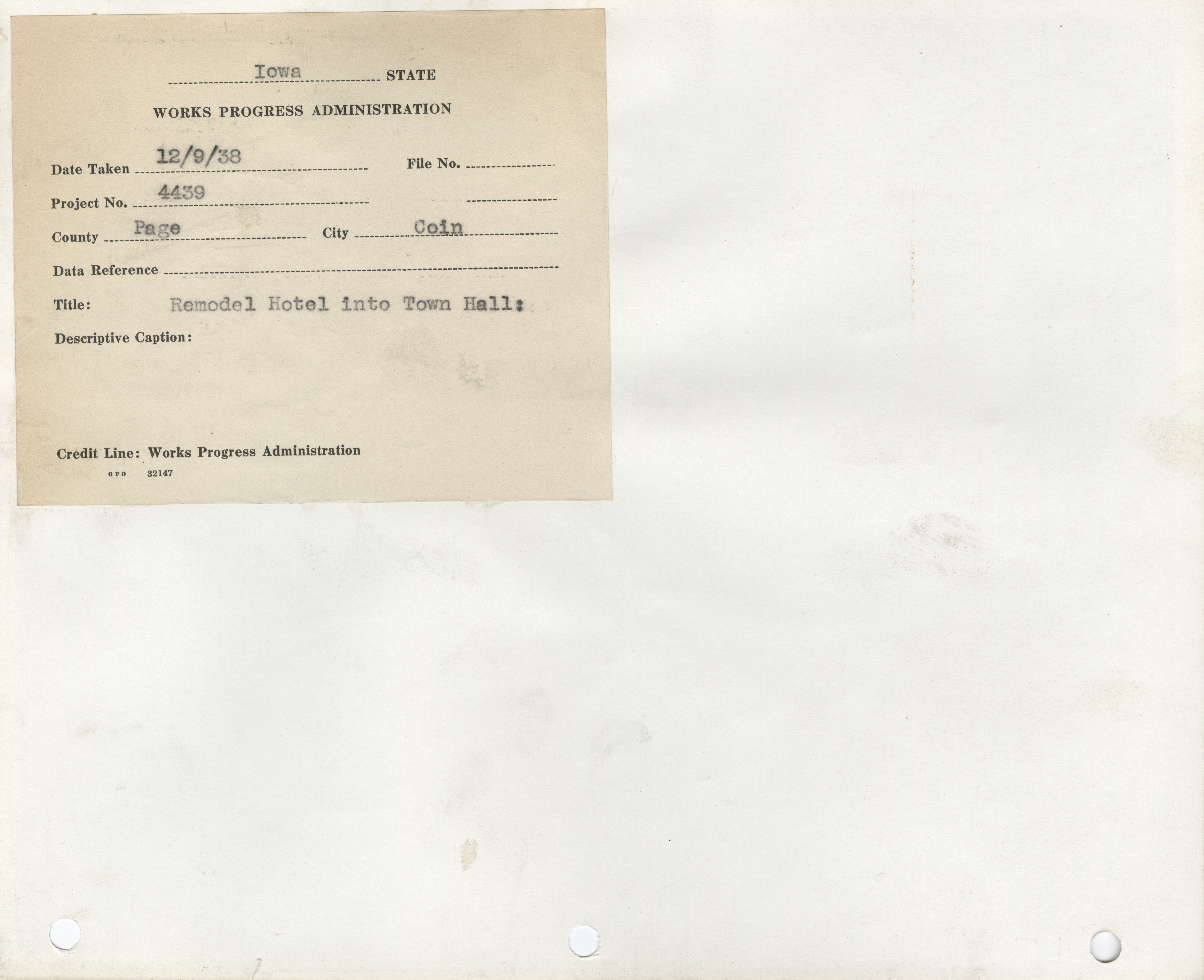 - Public Buildings. Page County. Coin. Remodeling Hotel into Town Hall. Project 4439. (1 b/w photograph), 1938
