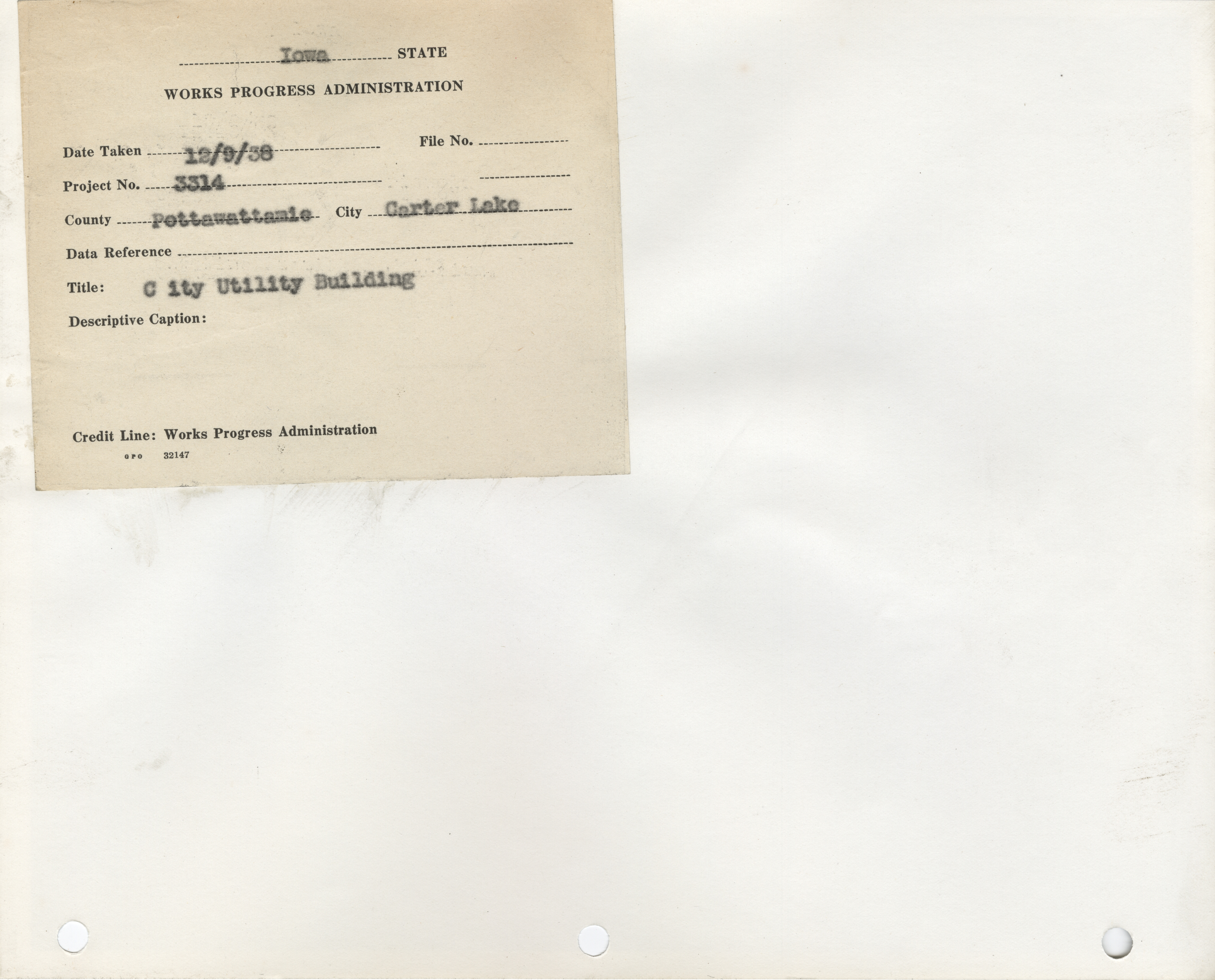 - Public Buildings. Pottawattamie County. Carter Lake. Utility Building. Project 3314. (1 b/w photograph), 1938