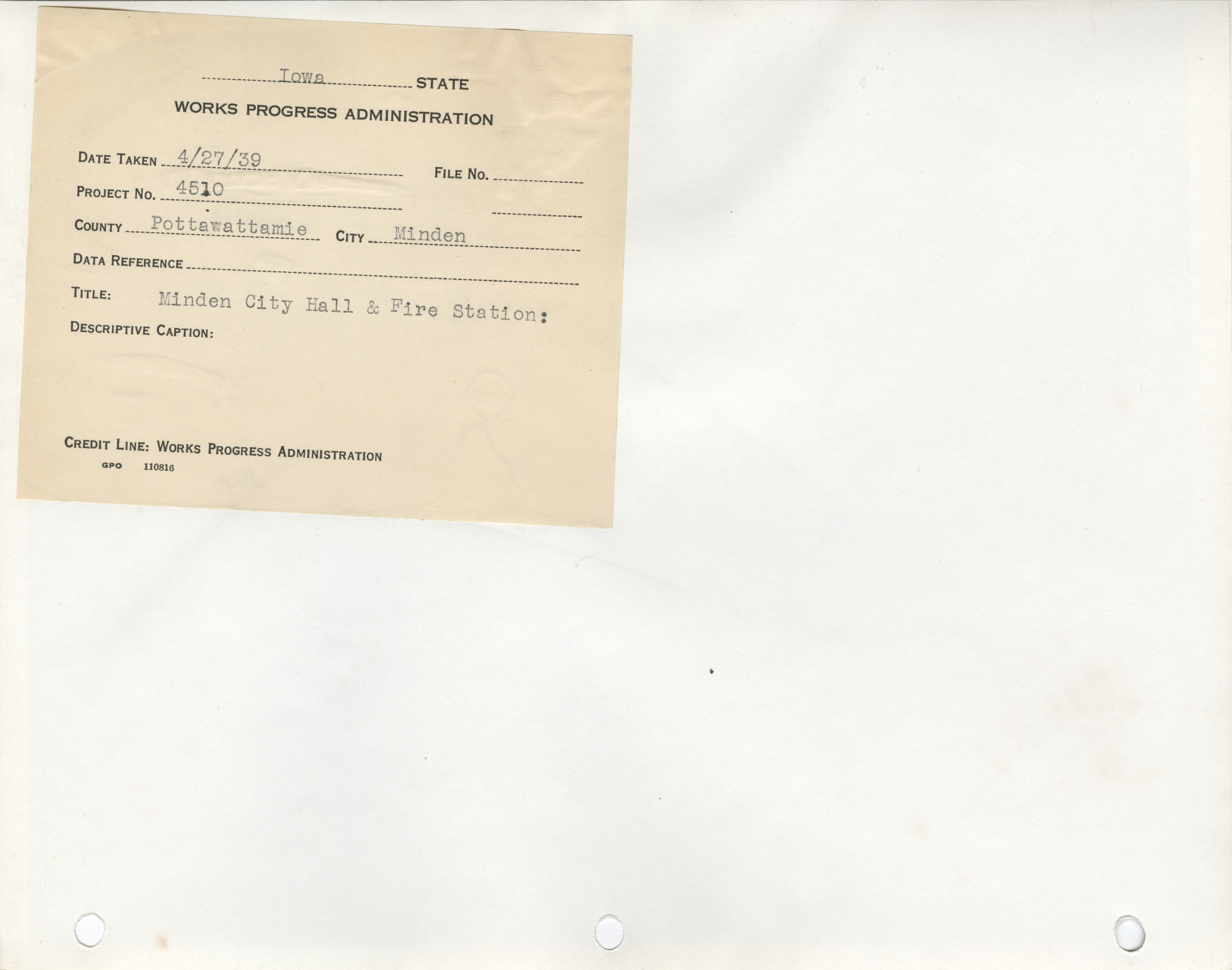 - Public Buildings. Pottawattamie County. Minden. City Hall. Project 4510. (3 b/w photographs), 1938-1939