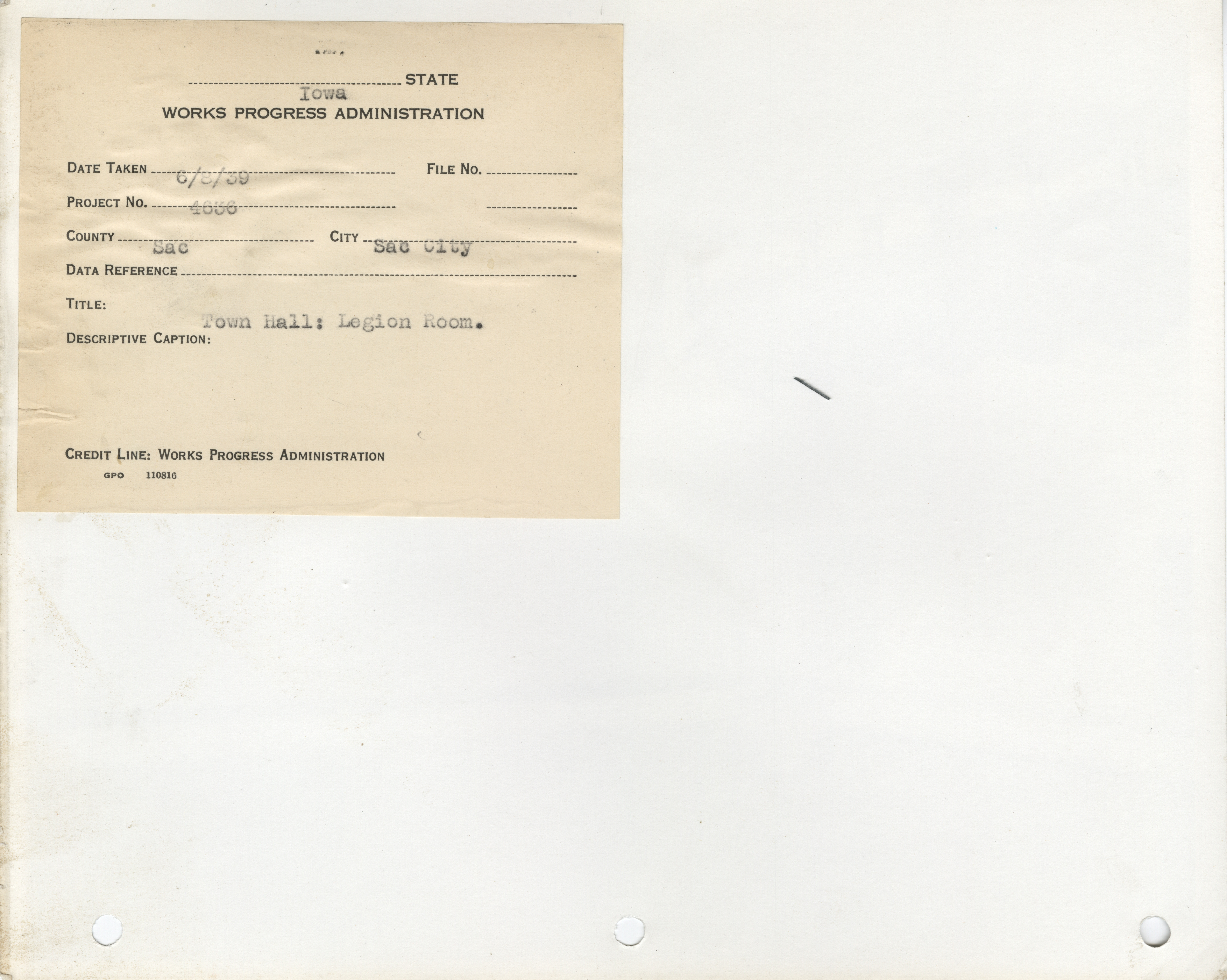 - Public Buildings. Sac County. Sac City. Legion Room, Town Hall. Project 4636. (1 b/w photograph), 1939