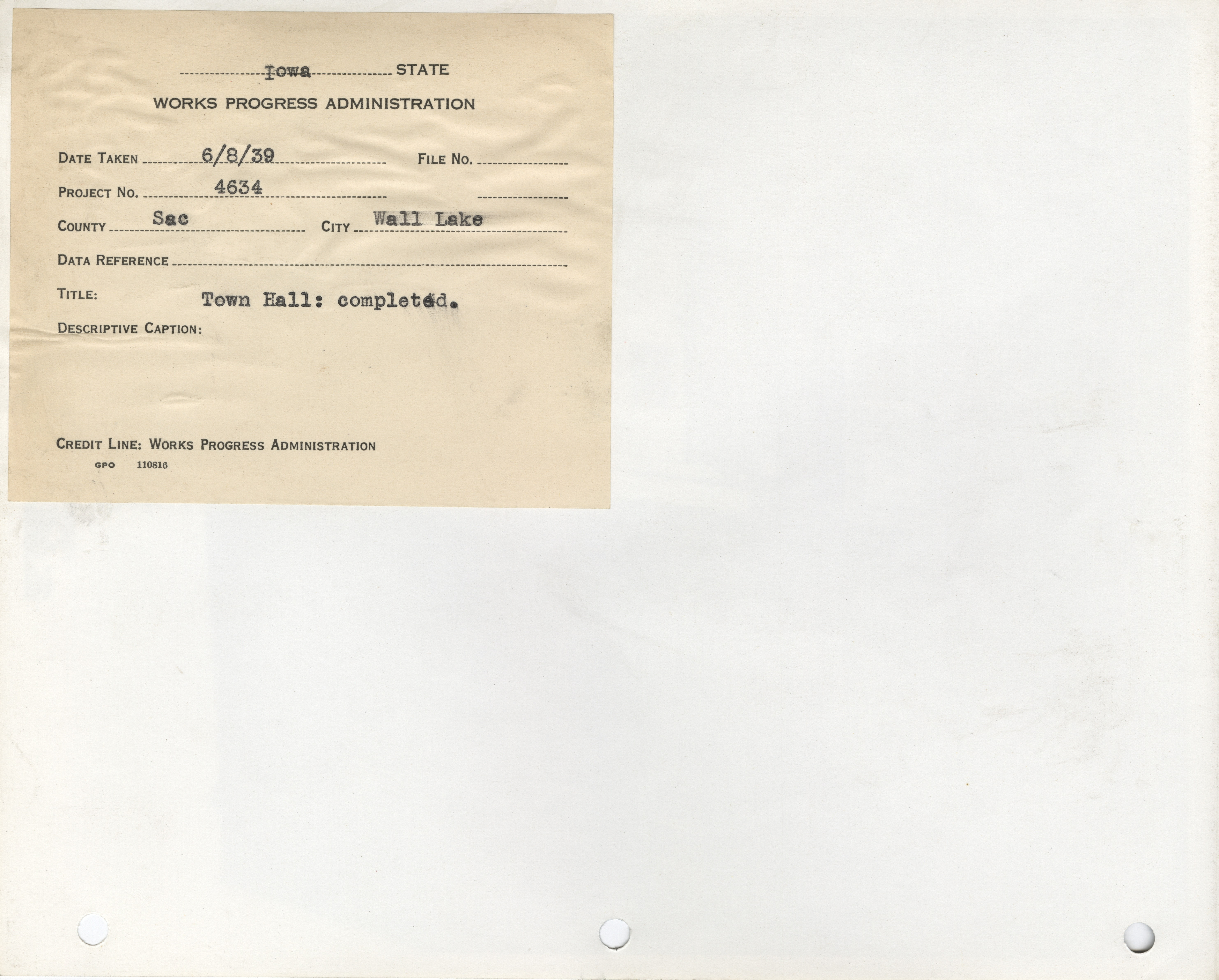 - Public Buildings. Sac County. Wall Lake. Town Hall. Project 4634. (4 b/w photographs), 1939