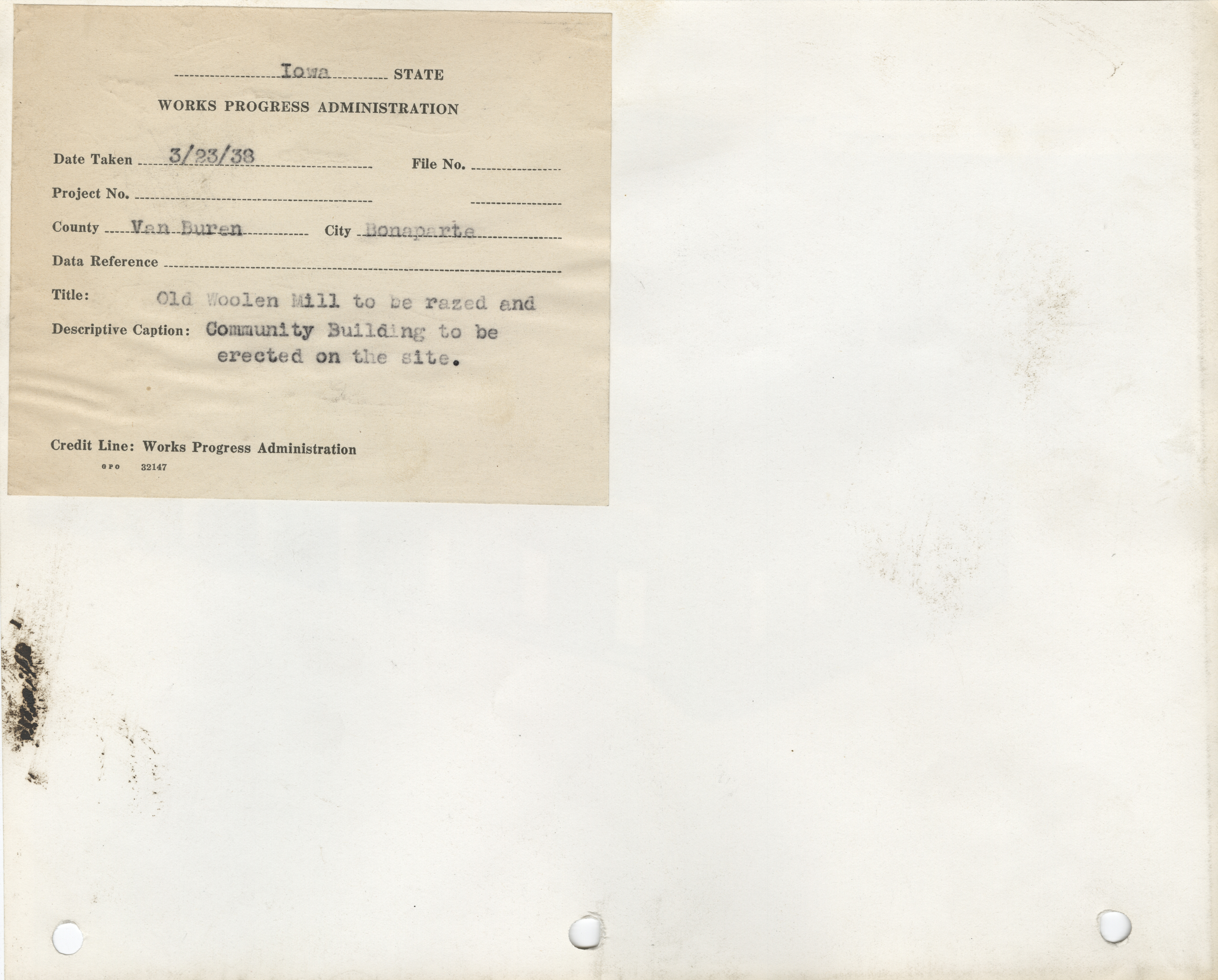 - Public Buildings. Van Buren County. Bonaparte. Old Woolen Mill to be Razed for Community Building. (1 b/w photograph), 1938
