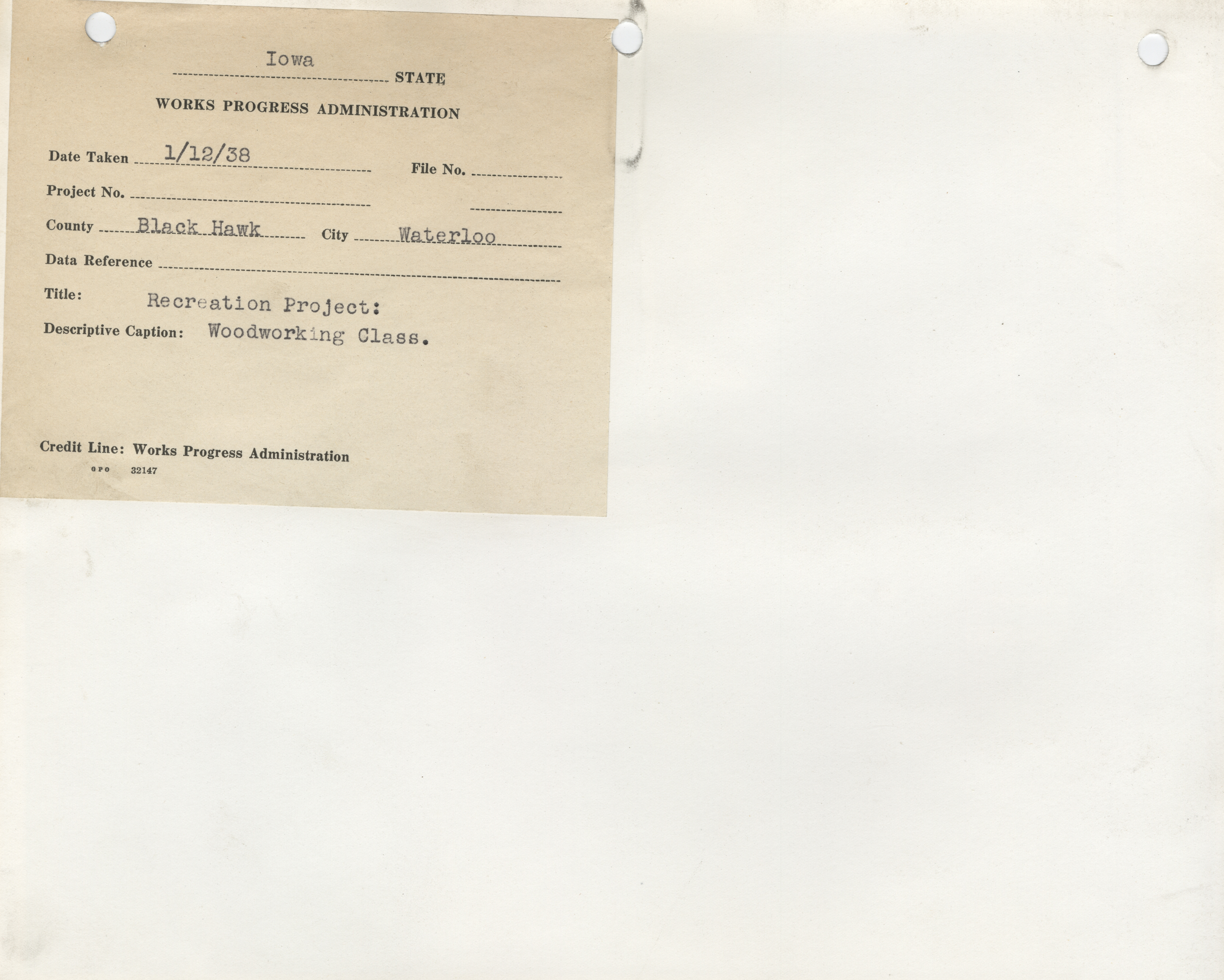 - "Photograph of a woodworking class in Waterloo", Work Projects Administration (Iowa) Photographs, Iowa State University Library Digital Collections