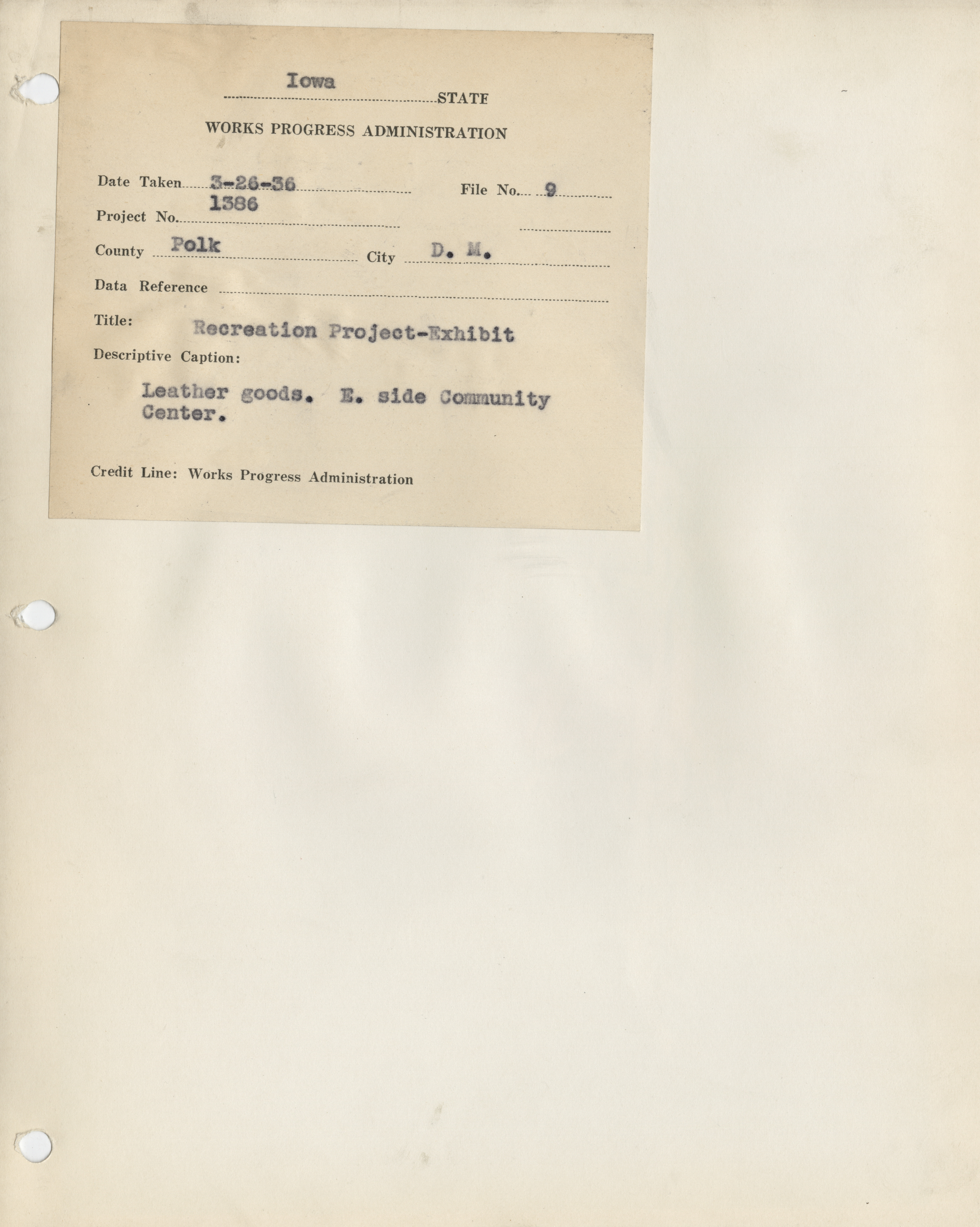 - "Photograph of a leather goods exhibit at the East Side Community Center in Des Moines", Work Projects Administration (Iowa) Photographs, Iowa State University Library Digital Collections