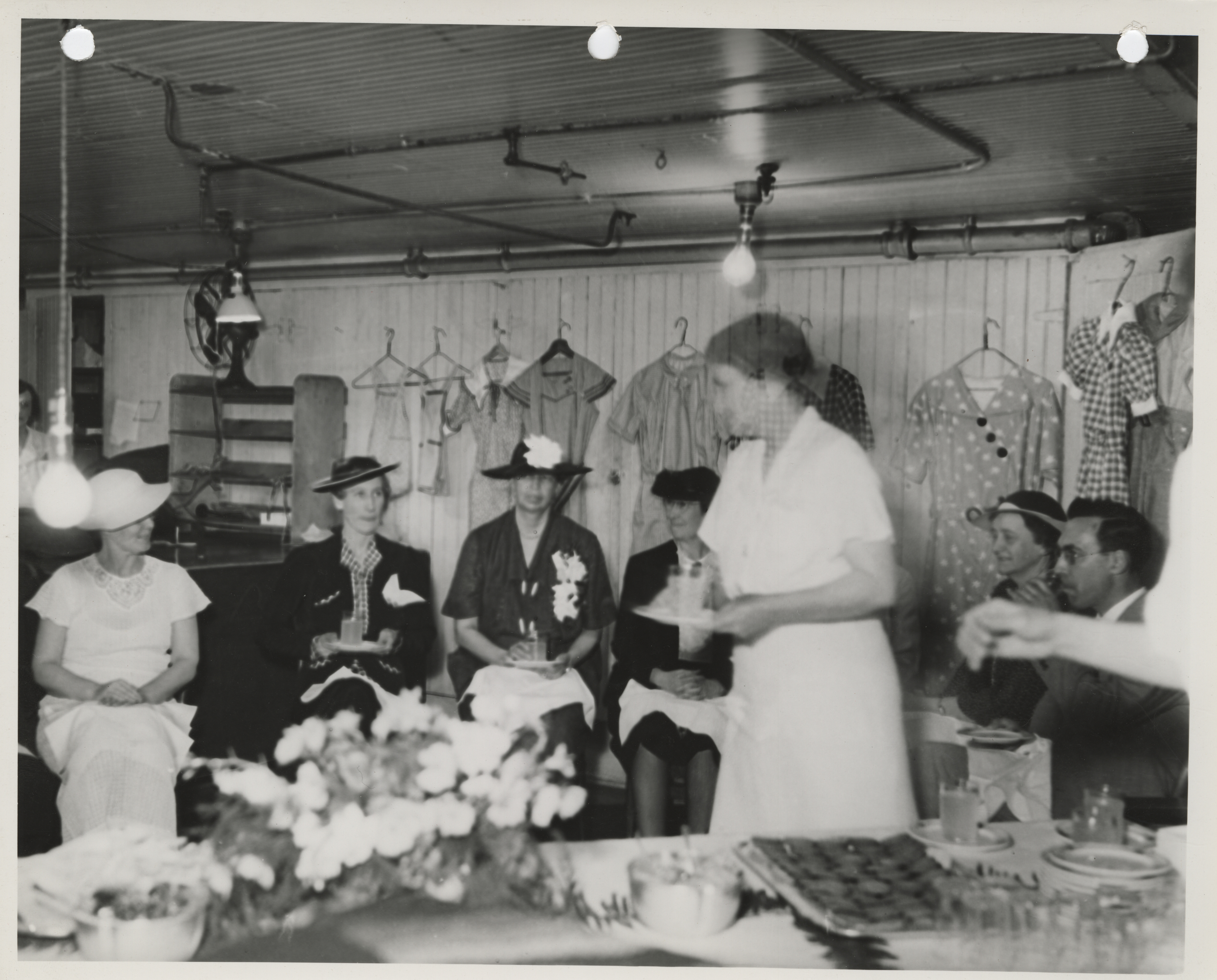 Photograph of Eleanor Roosevelt having lunch at the Sheuerman Brothers Mill in Des Moines Item Info