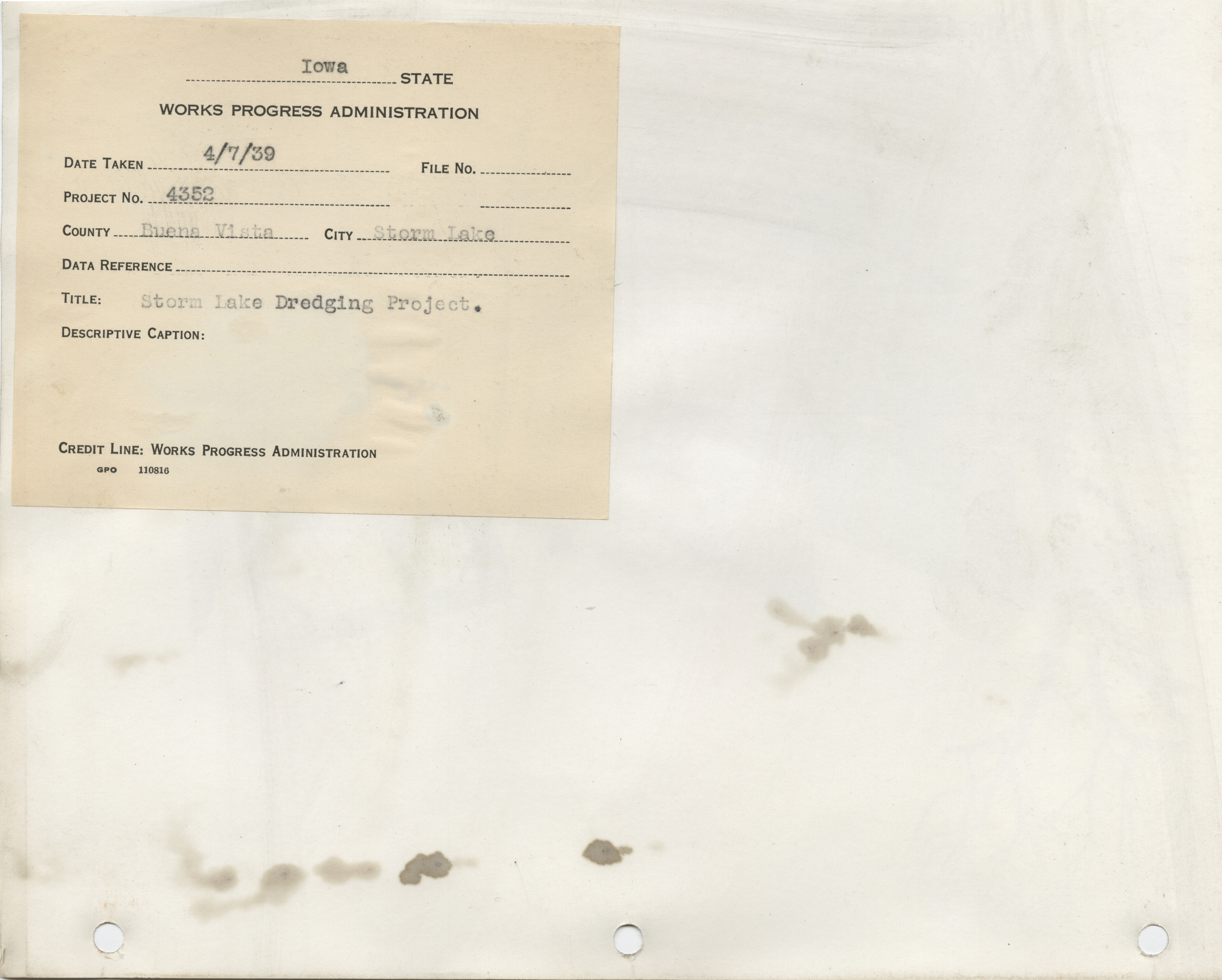- Sanitation and Water Supply. Buena Vista County. Storm Lake. Lake Dredging Project. Project 4352. (2 b/w photographs), 1939