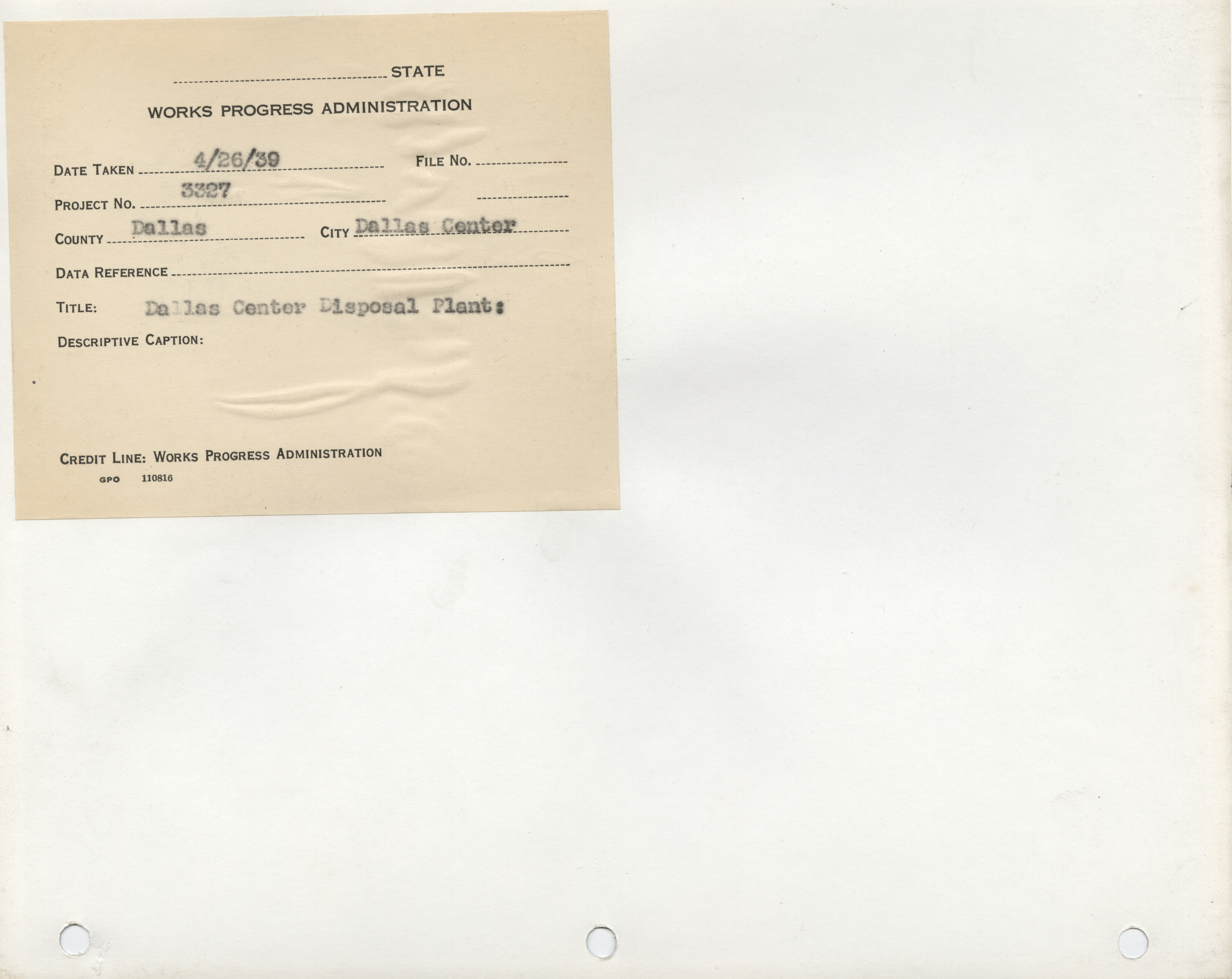 - Sanitation and Water Supply. Dallas County. Dallas Center. Disposal Plant. Project 3327. (3 b/w photographs), 1939