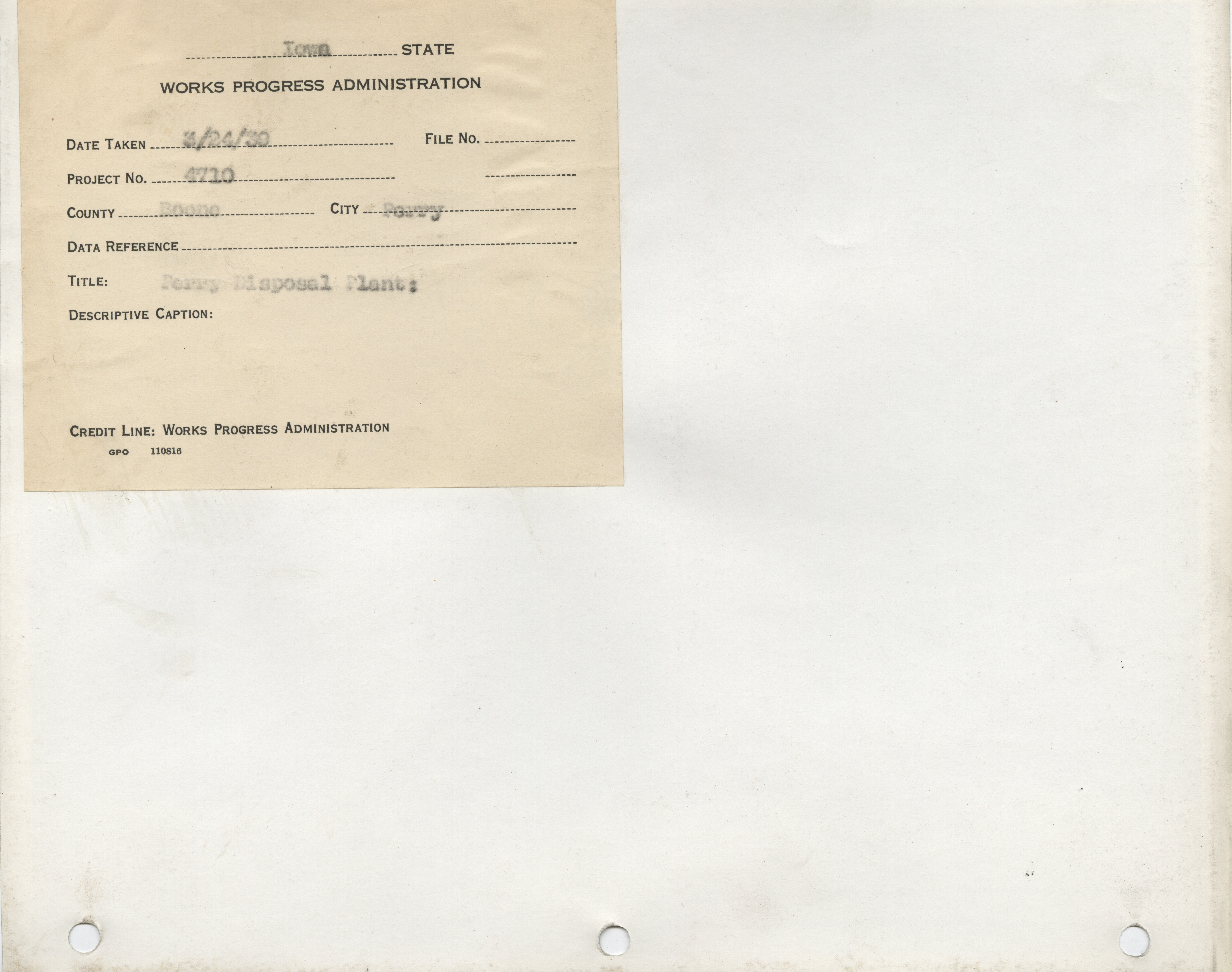 - "Photograph of the disposal plant in Perry", Work Projects Administration (Iowa) Photographs, Iowa State University Library Digital Collections