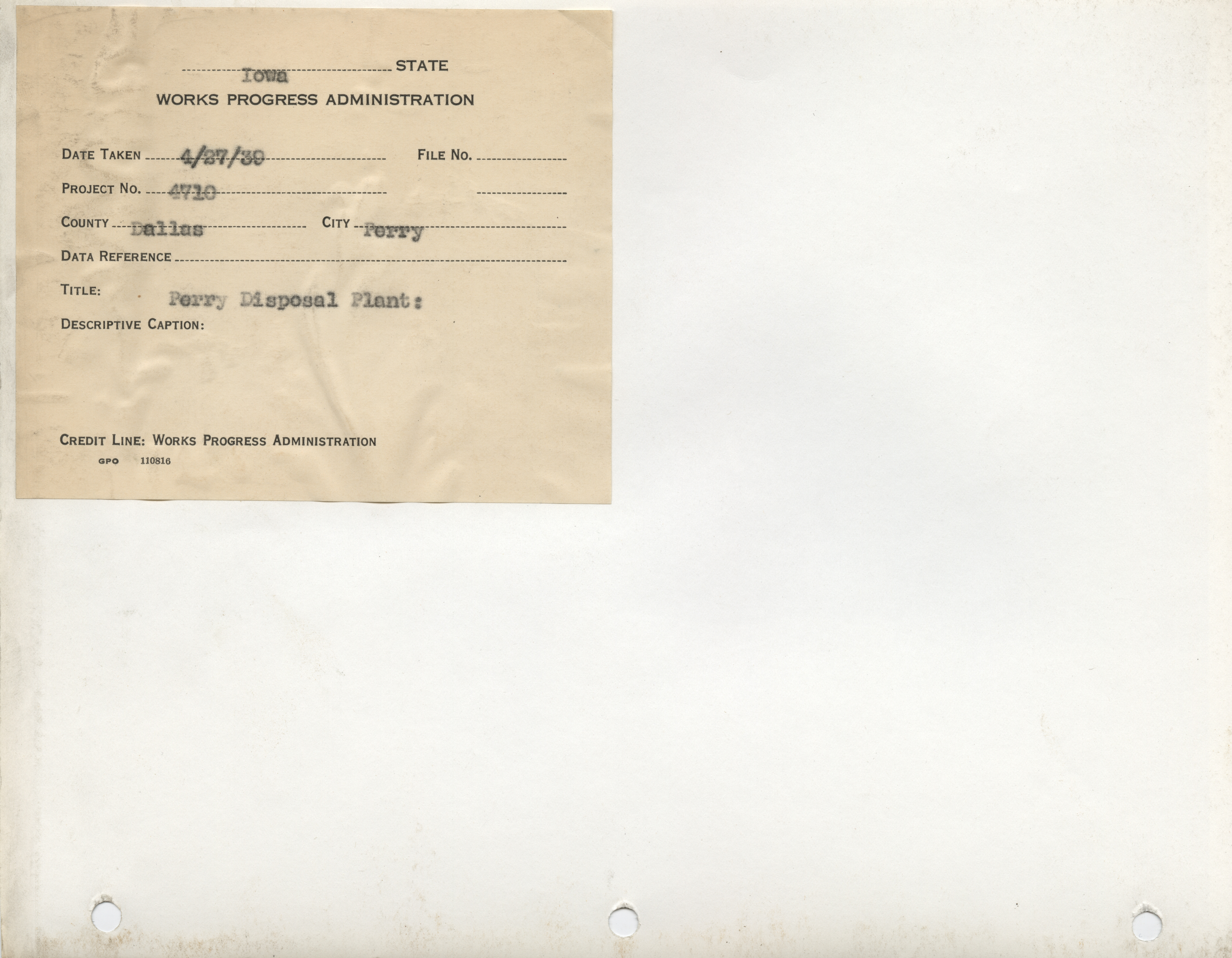 - "Photograph of construction of the disposal plant in Perry", Work Projects Administration (Iowa) Photographs, Iowa State University Library Digital Collections