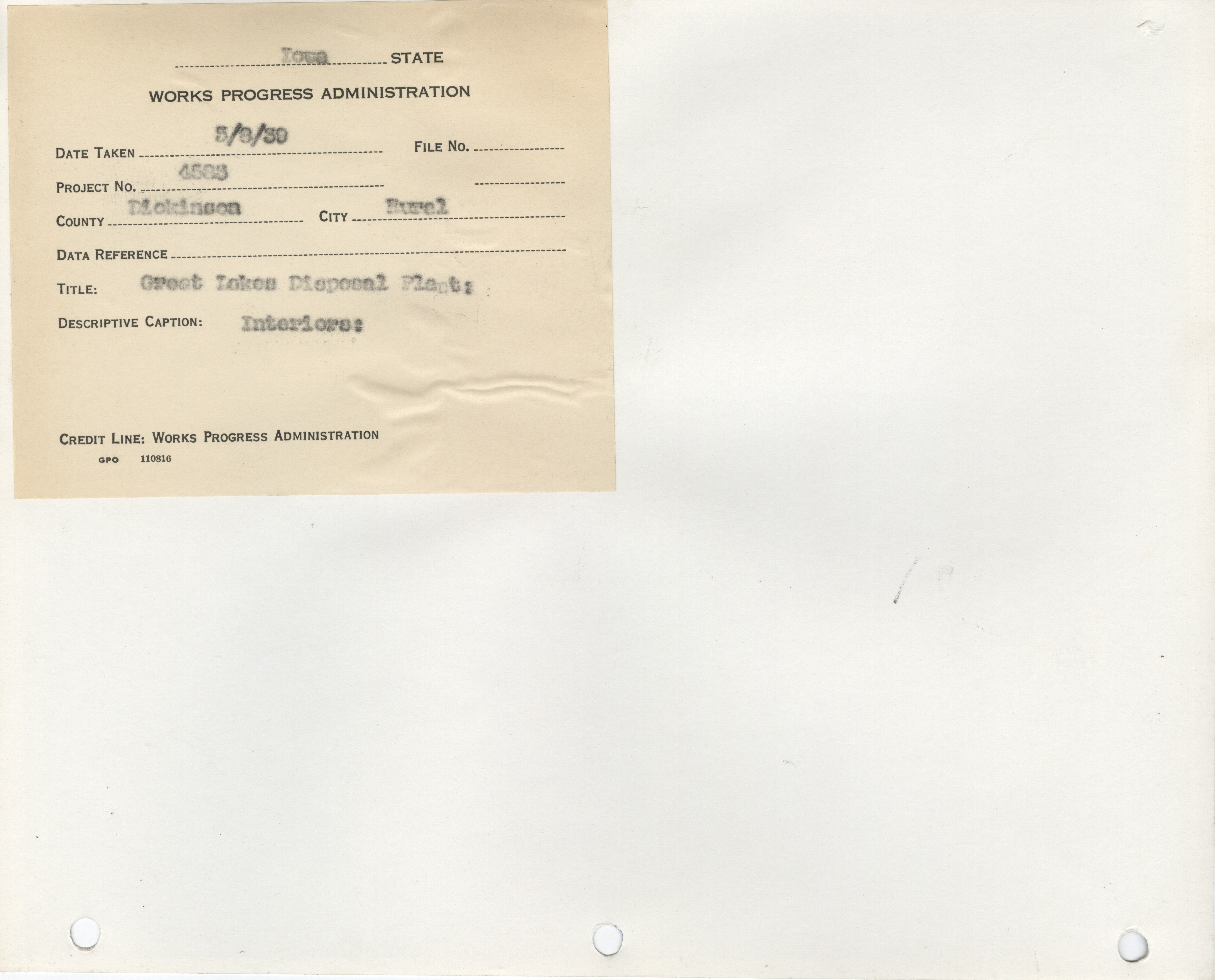 - "Photograph of the interior of a disposal plant in Dickinson County", Work Projects Administration (Iowa) Photographs, Iowa State University Library Digital Collections