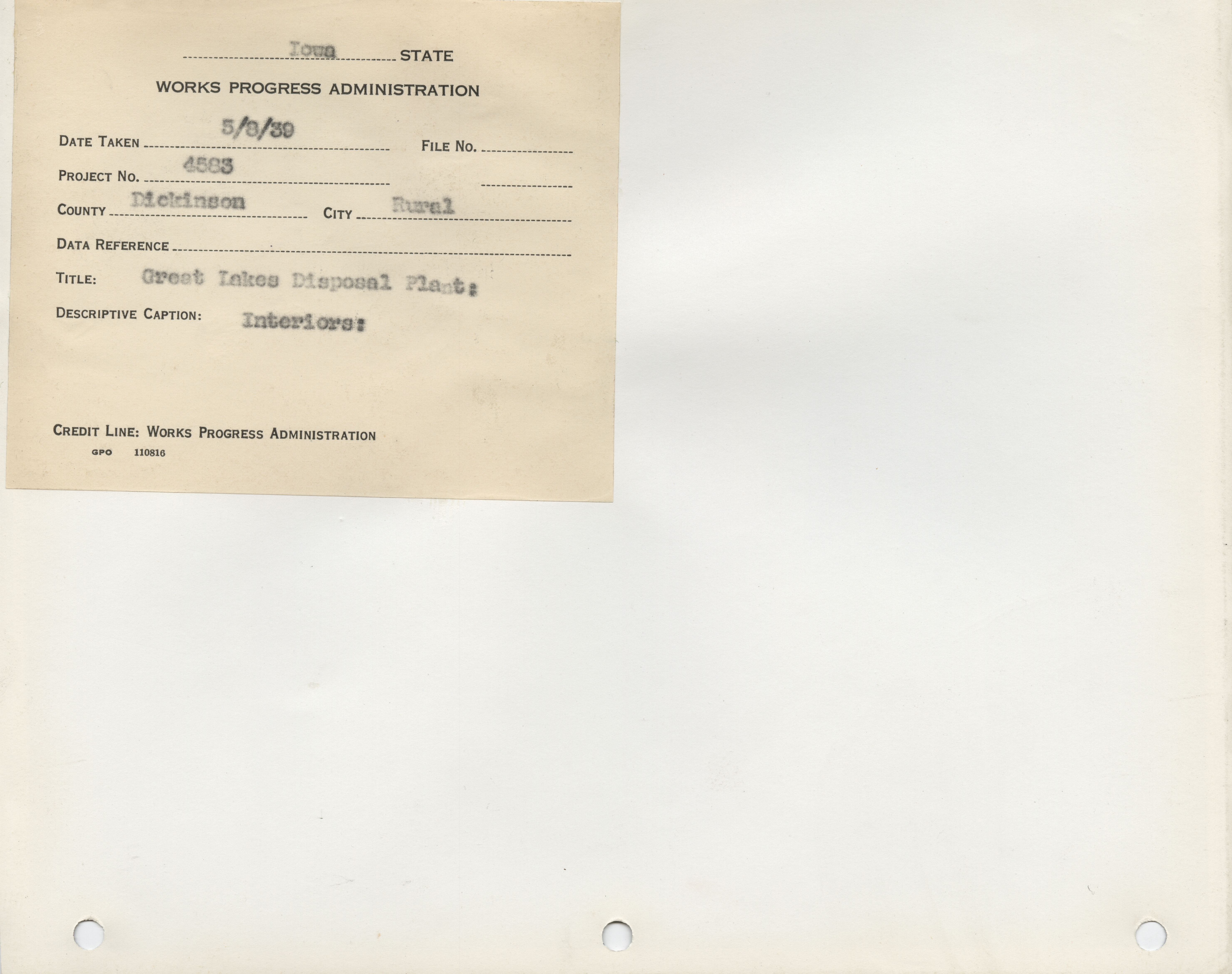 - Sanitation and Water Supply. Dickinson County. Great Lakes Disposal Plant. Project 4583. (16 b/w photographs), 1939