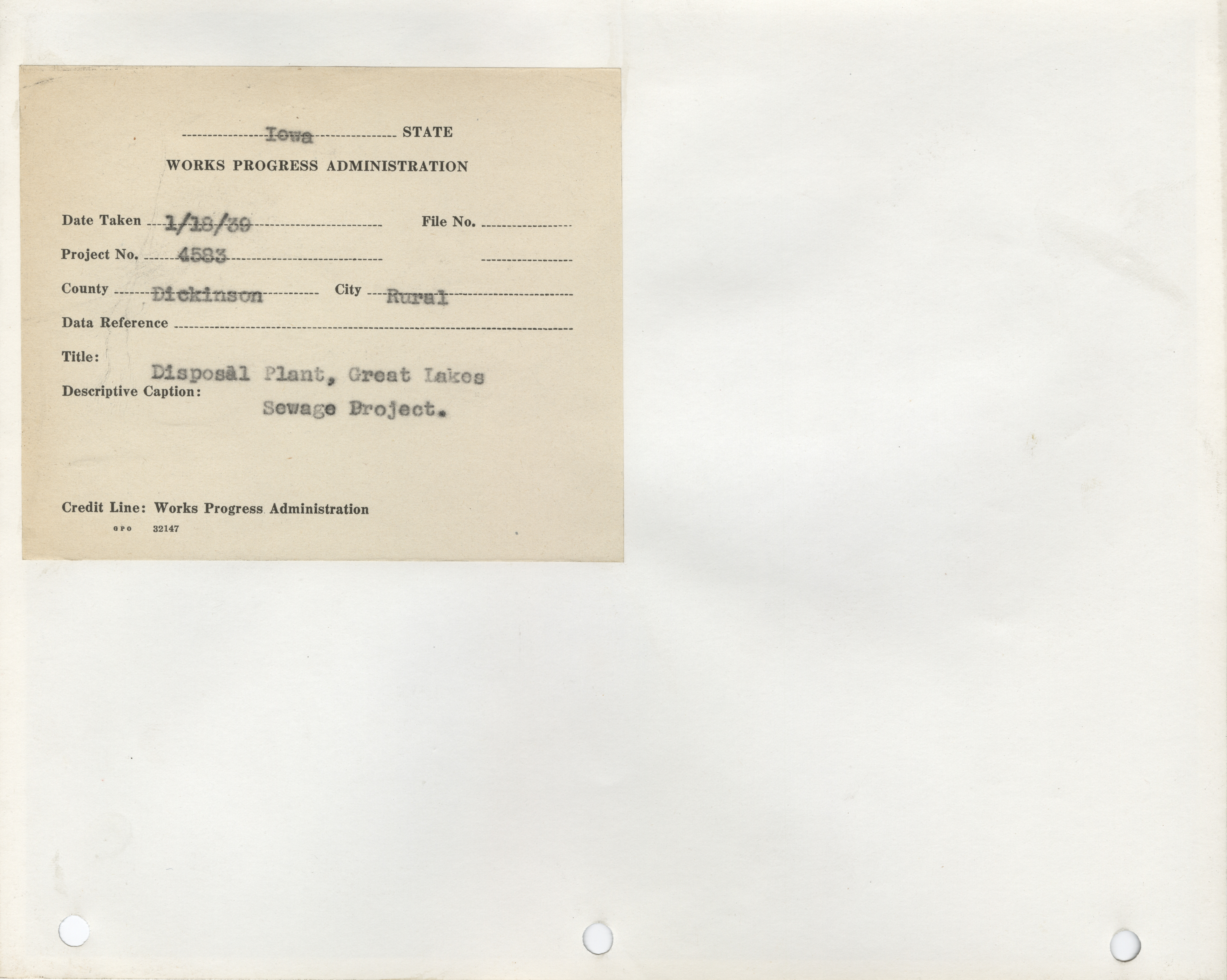 - "Photograph of a disposal plant in Dickinson County", Work Projects Administration (Iowa) Photographs, Iowa State University Library Digital Collections