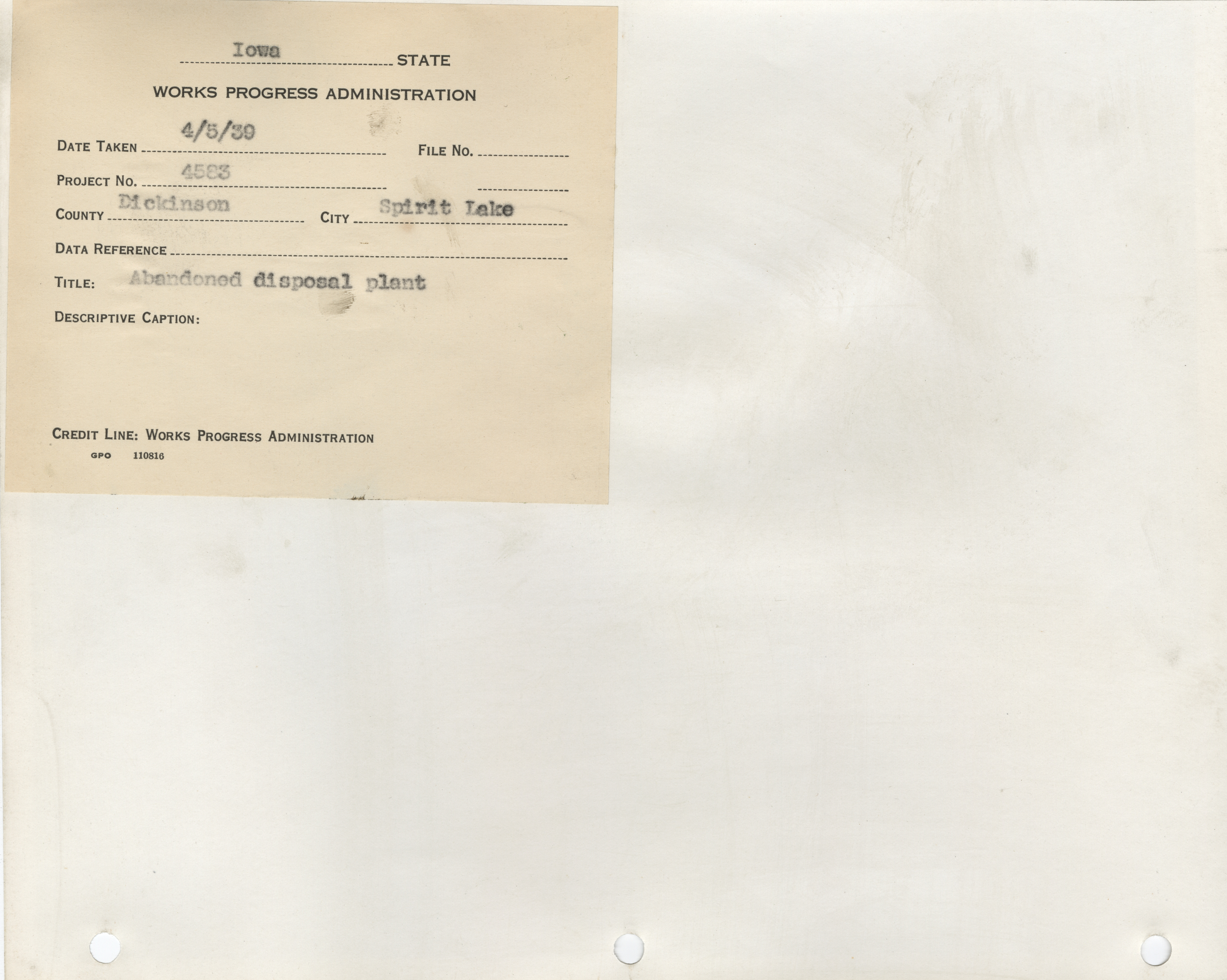 - "Photograph of an abandoned disposal plant in Spirit Lake", Work Projects Administration (Iowa) Photographs, Iowa State University Library Digital Collections