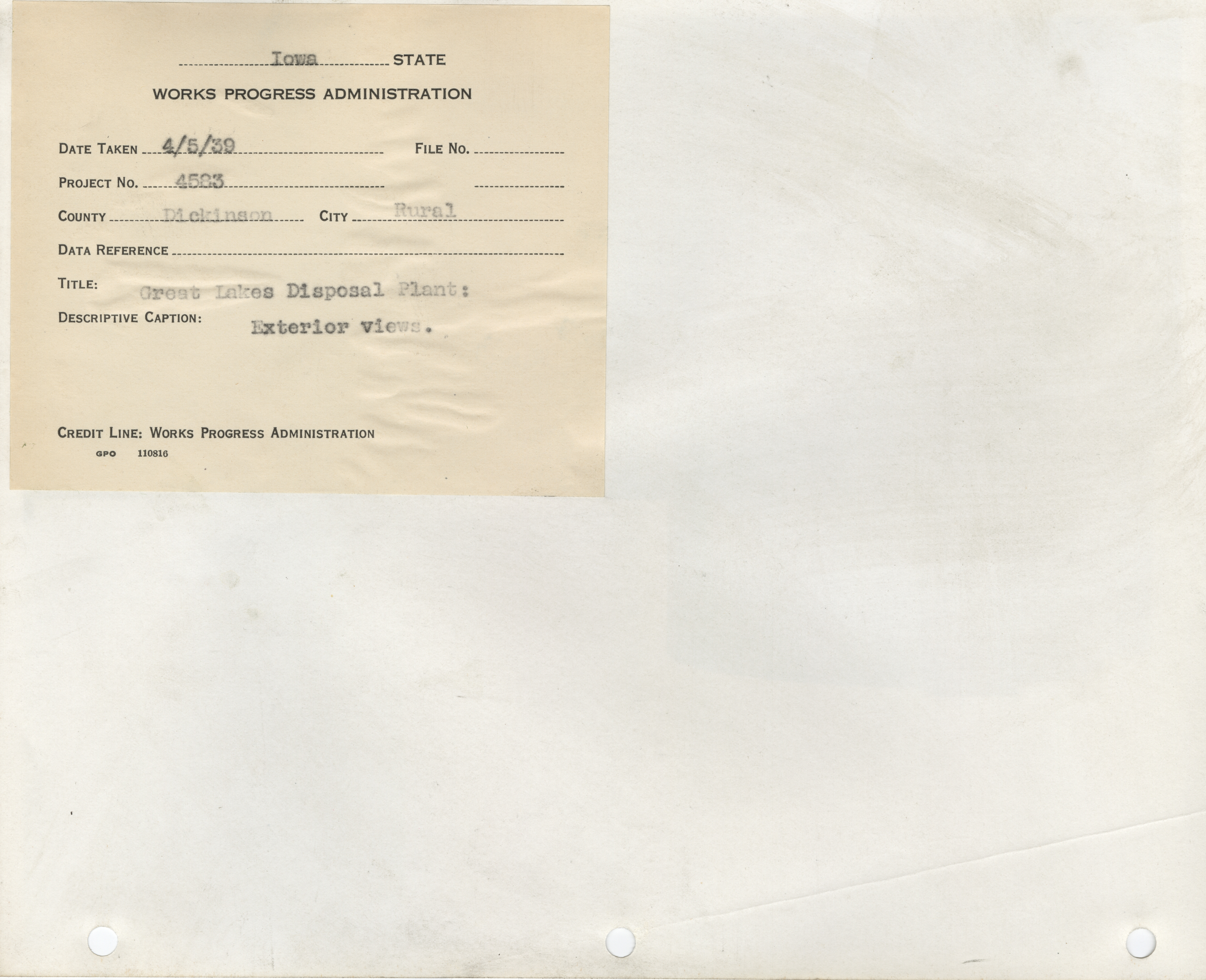 - "Photograph of a disposal plant in Dickinson County", Work Projects Administration (Iowa) Photographs, Iowa State University Library Digital Collections