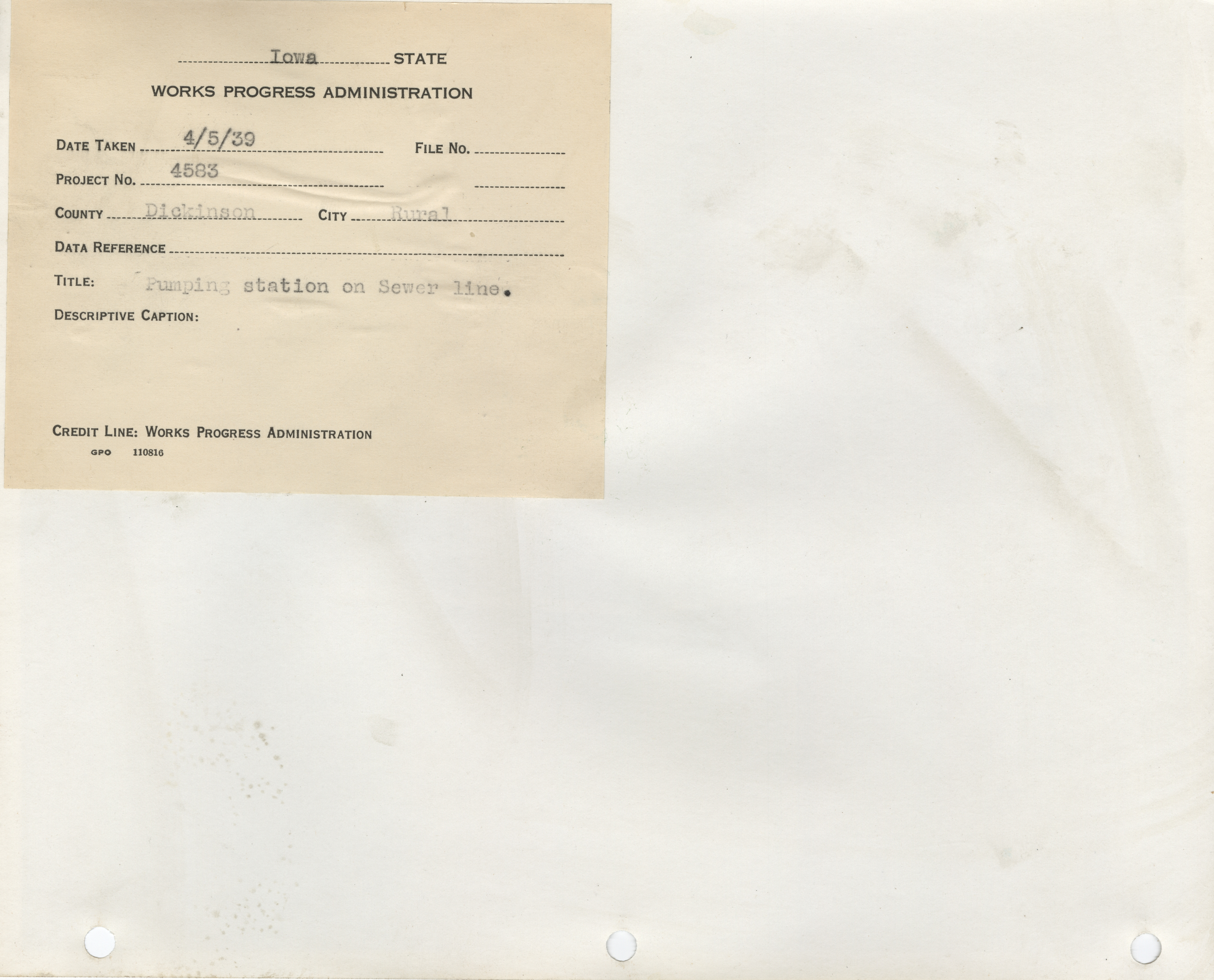 - "Photograph of a pumping station on a sewer line in Dickinson County", Work Projects Administration (Iowa) Photographs, Iowa State University Library Digital Collections