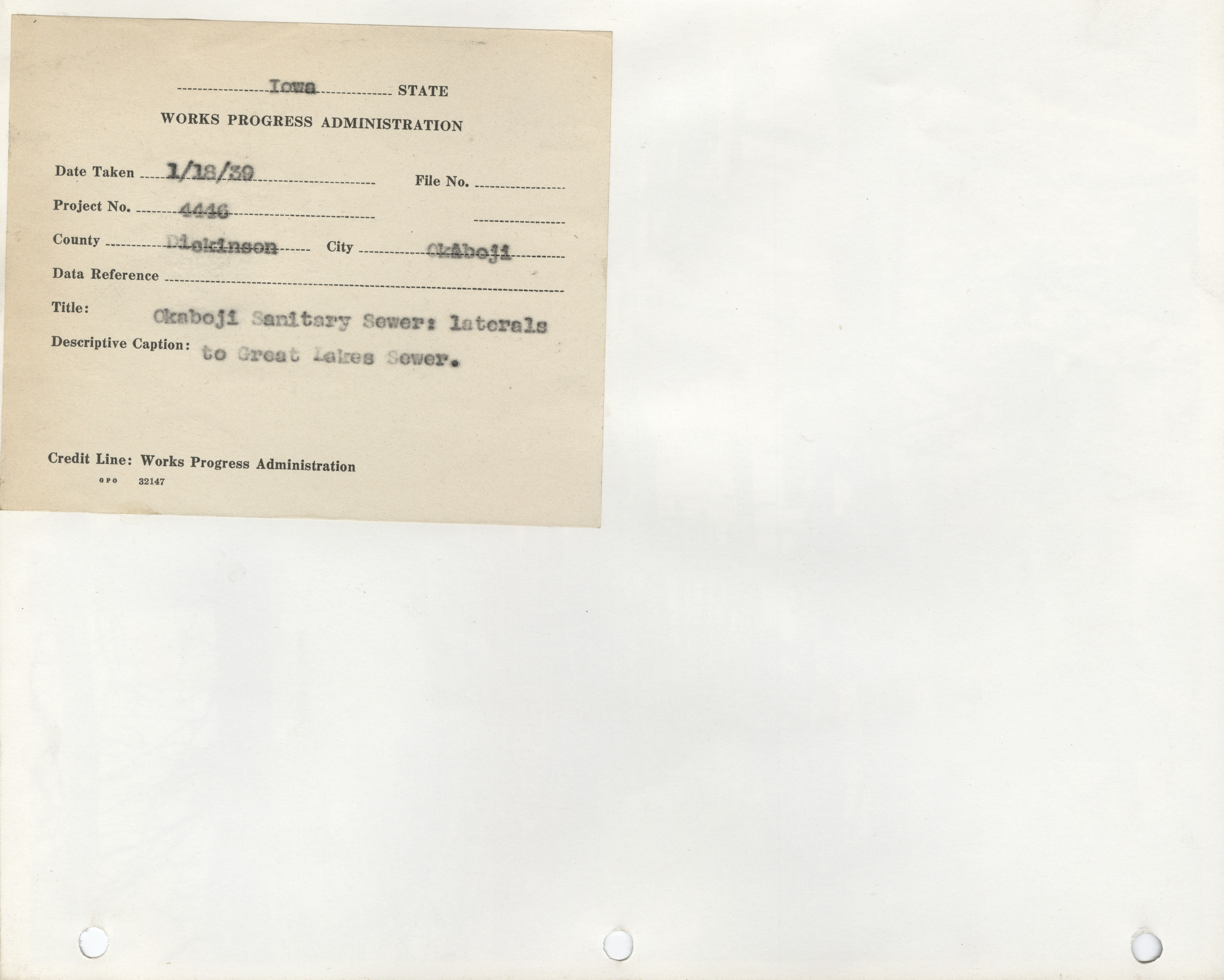 - Sanitation and Water Supply. Dickinson County. Okoboji. Sewer. Project 4446. (2 b/w photographs), 1939