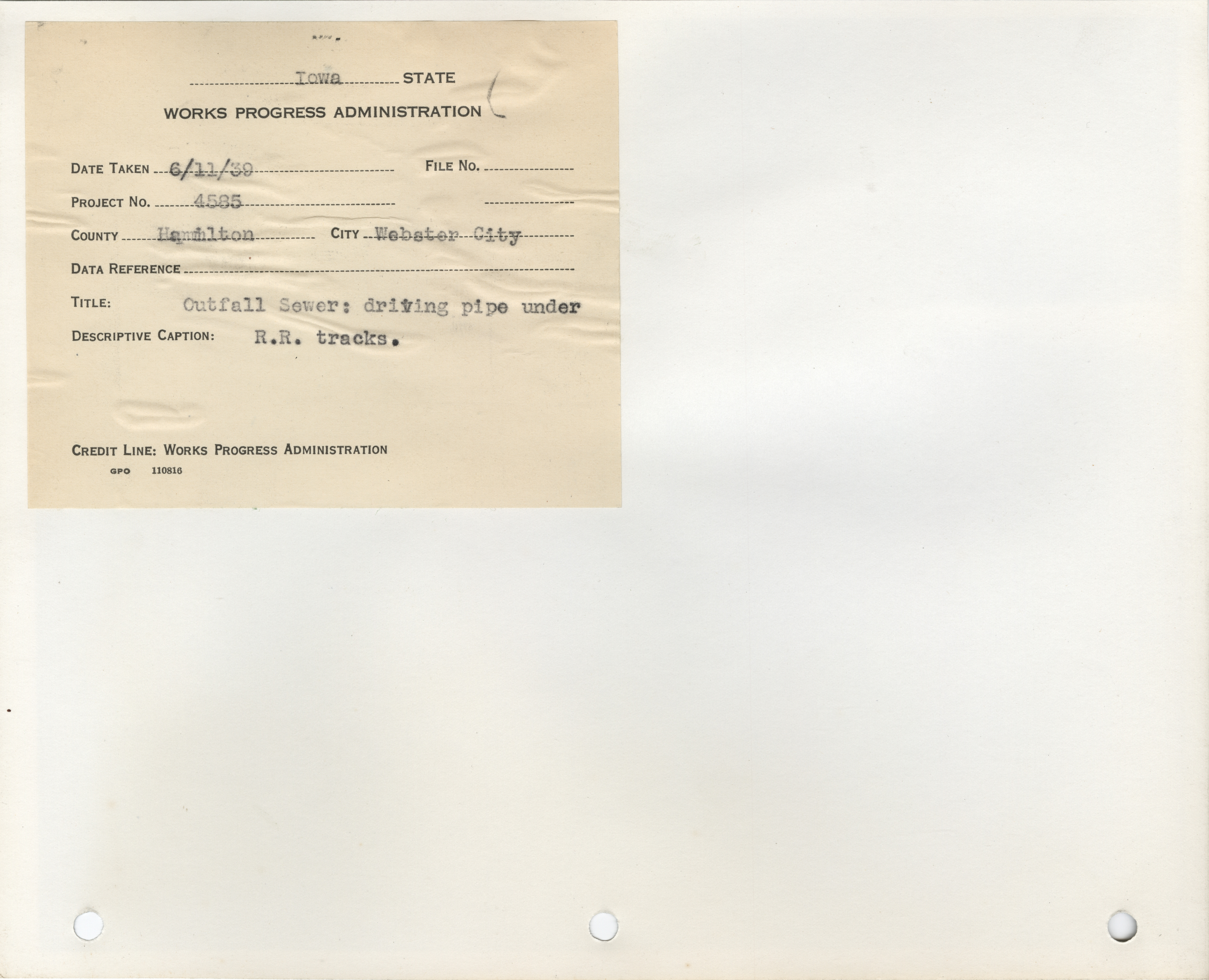- Sanitation and Water Supply. Hamilton County. Webster City. Outfall Sewer. Project 4585. (8 b/w photographs), 1939