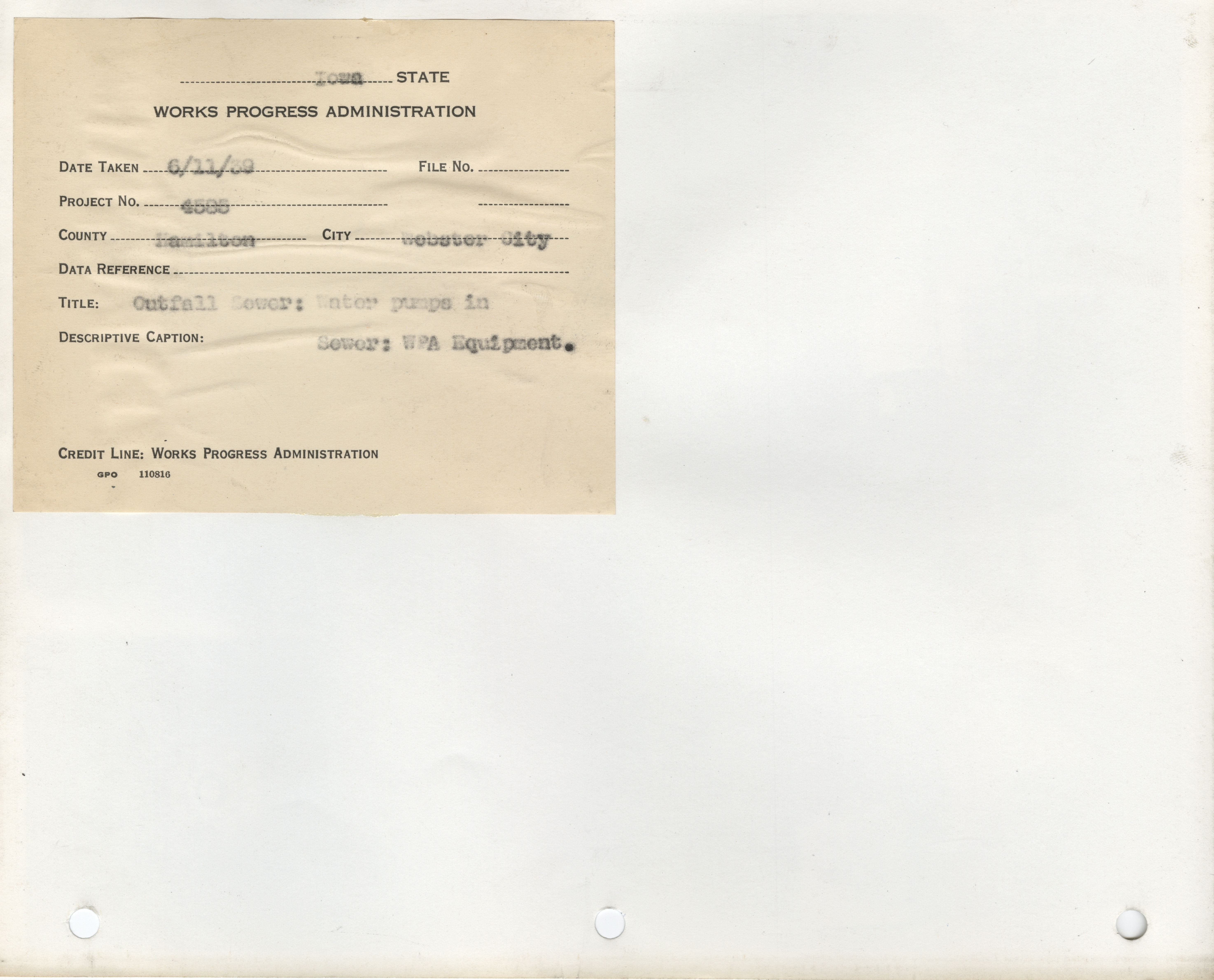 - Sanitation and Water Supply. Hamilton County. Webster City. Outfall Sewer. Project 4585. (8 b/w photographs), 1939