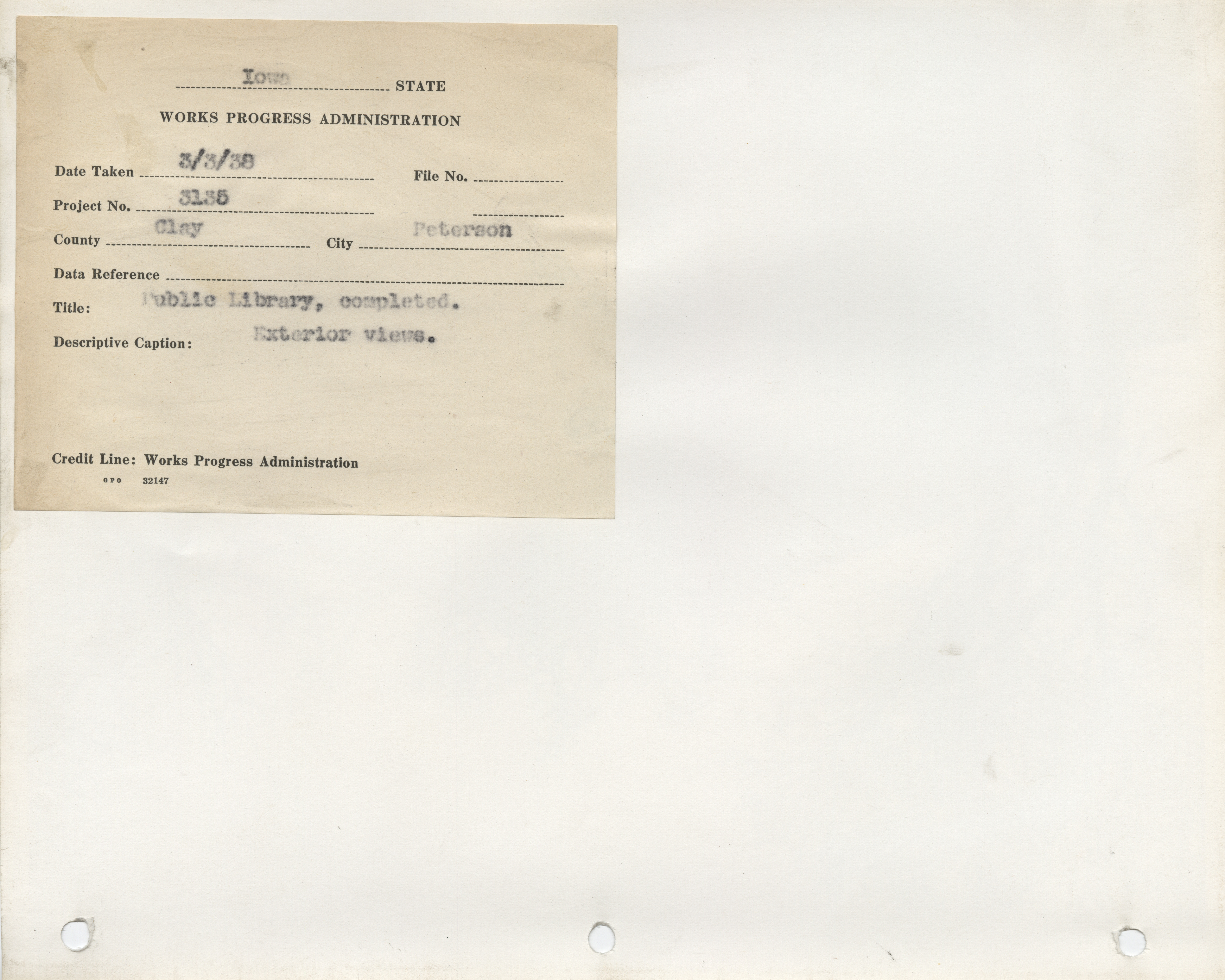 - "Photograph of the public library in Peterson", Work Projects Administration (Iowa) Photographs, Iowa State University Library Digital Collections